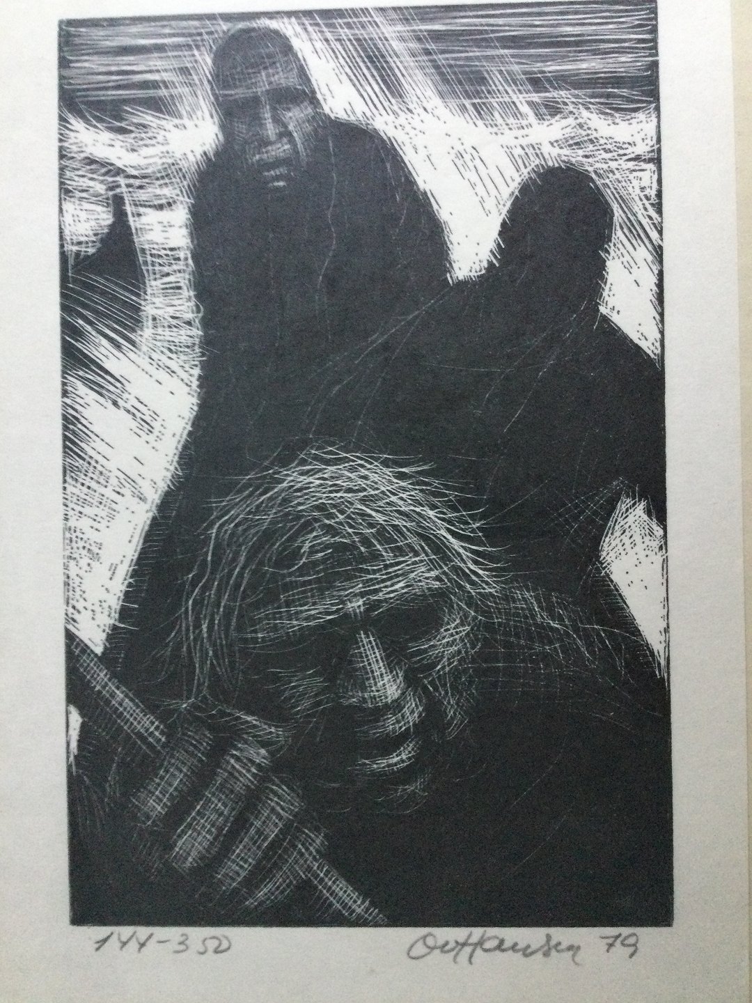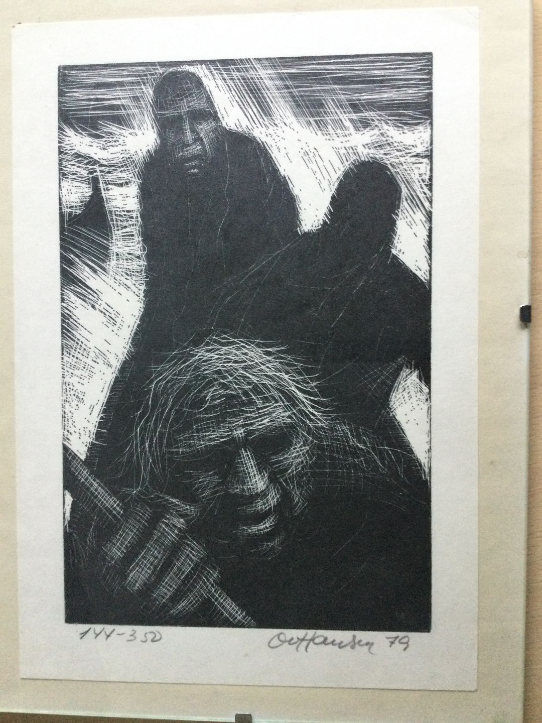 Træsnit af Ole Vang Hansen - Grønlandske Fangere 1979.