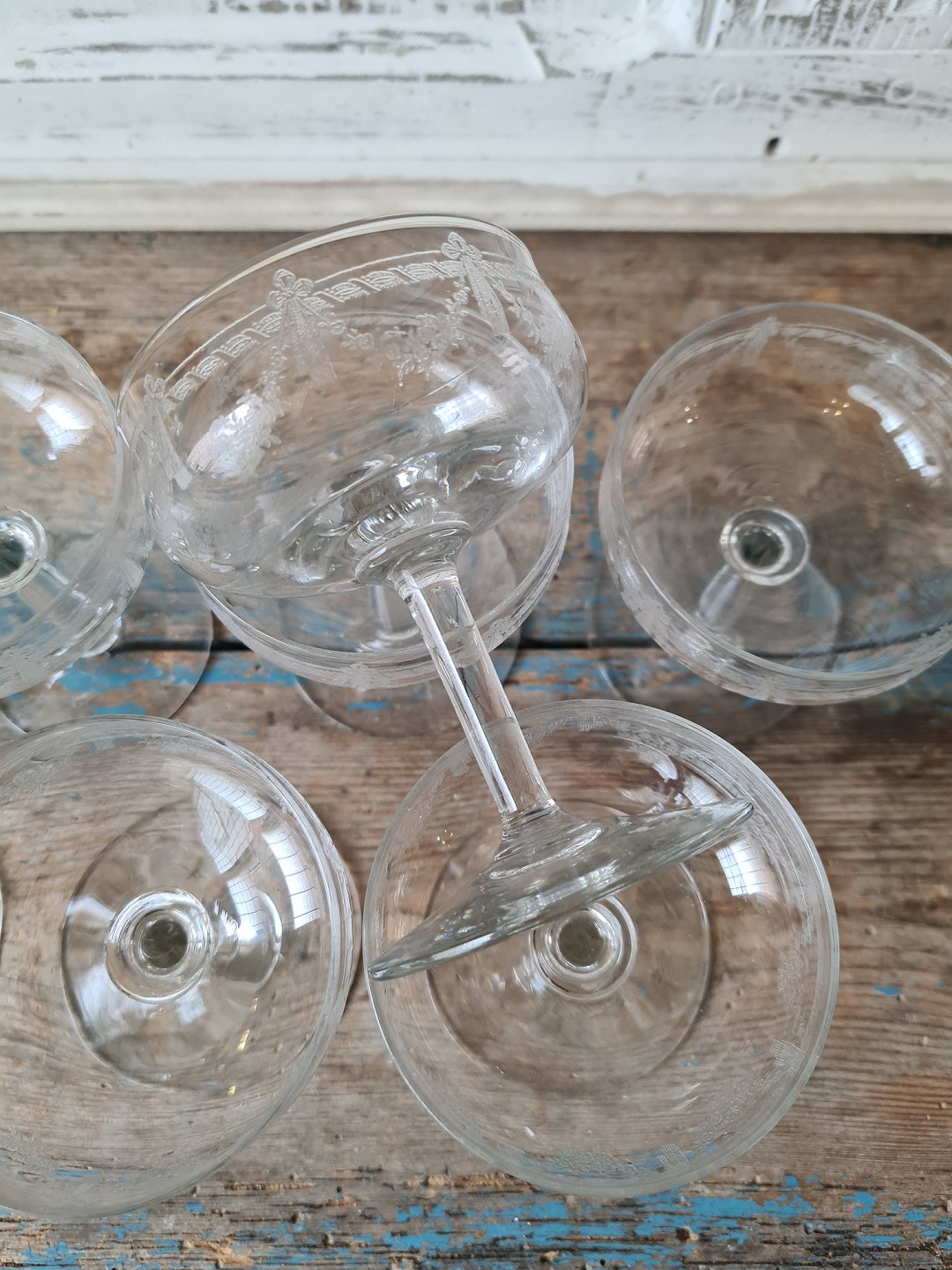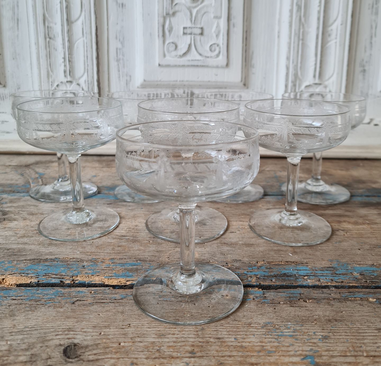 Sæt på 8 franske champagneskåle med smuk ætset dekoration.
