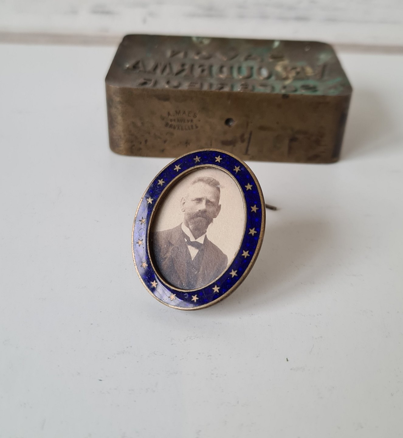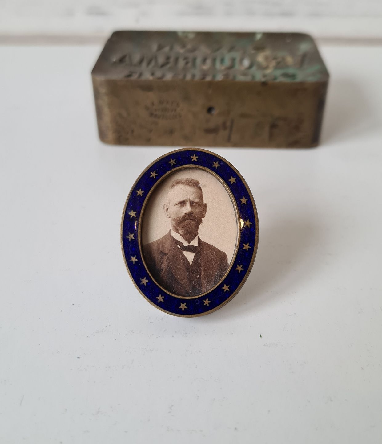 Smuk gammel miniature ramme med blå emalje dekoreret med stjerner.