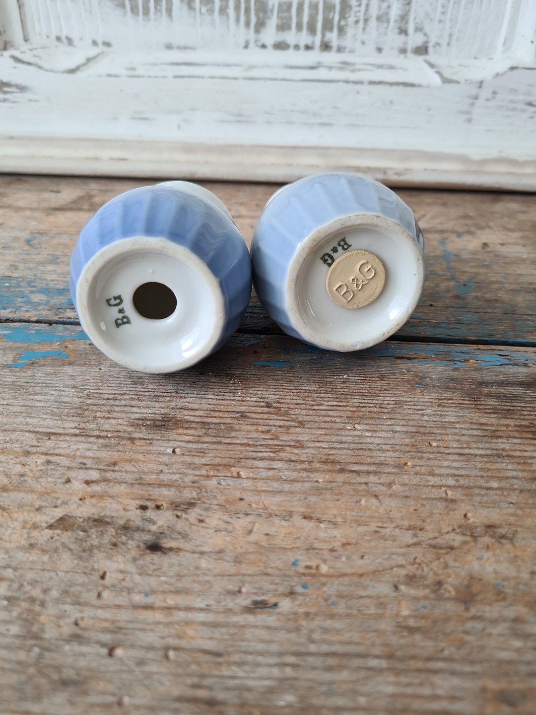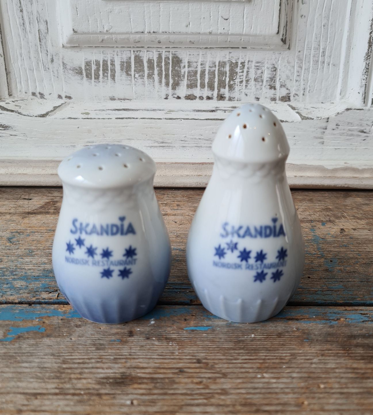 B&G Blå Tone salt og pebersæt med logo "Skandia Nordisk Restaurant"