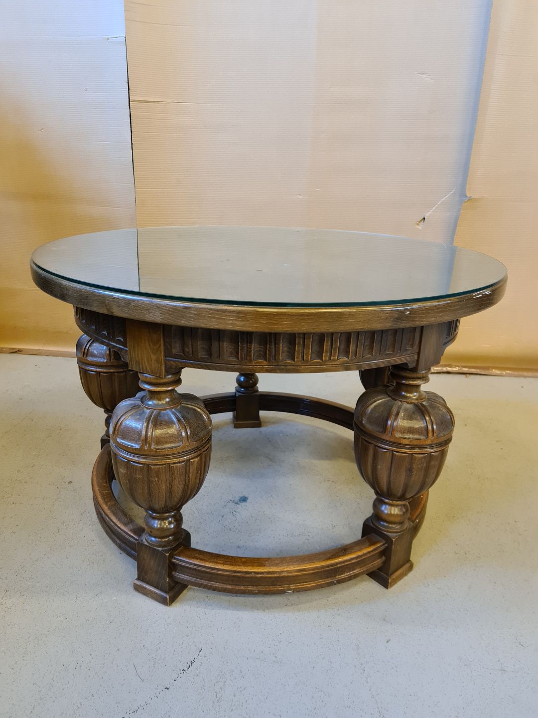 Rundt sofabord i fineret egetræ med glasplader fra 1930erne.