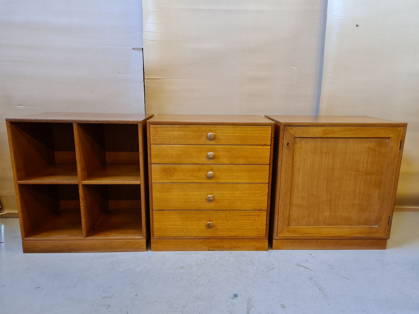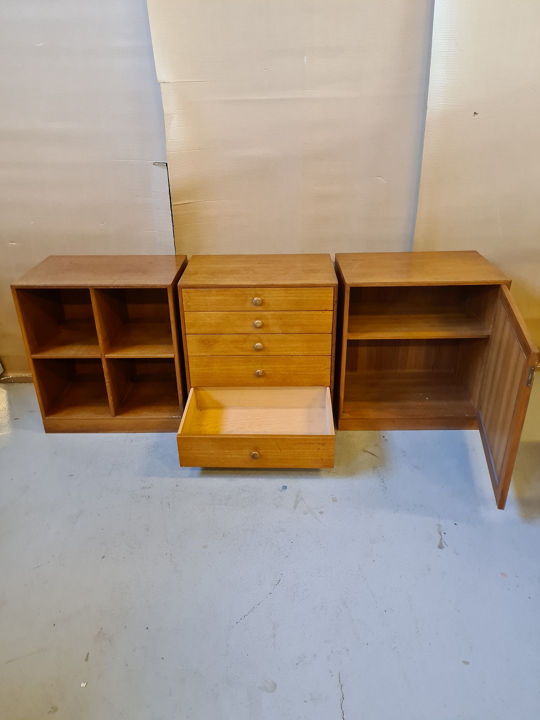 Reol,kommode og skab i fineret teaktræ fra 1960erne.