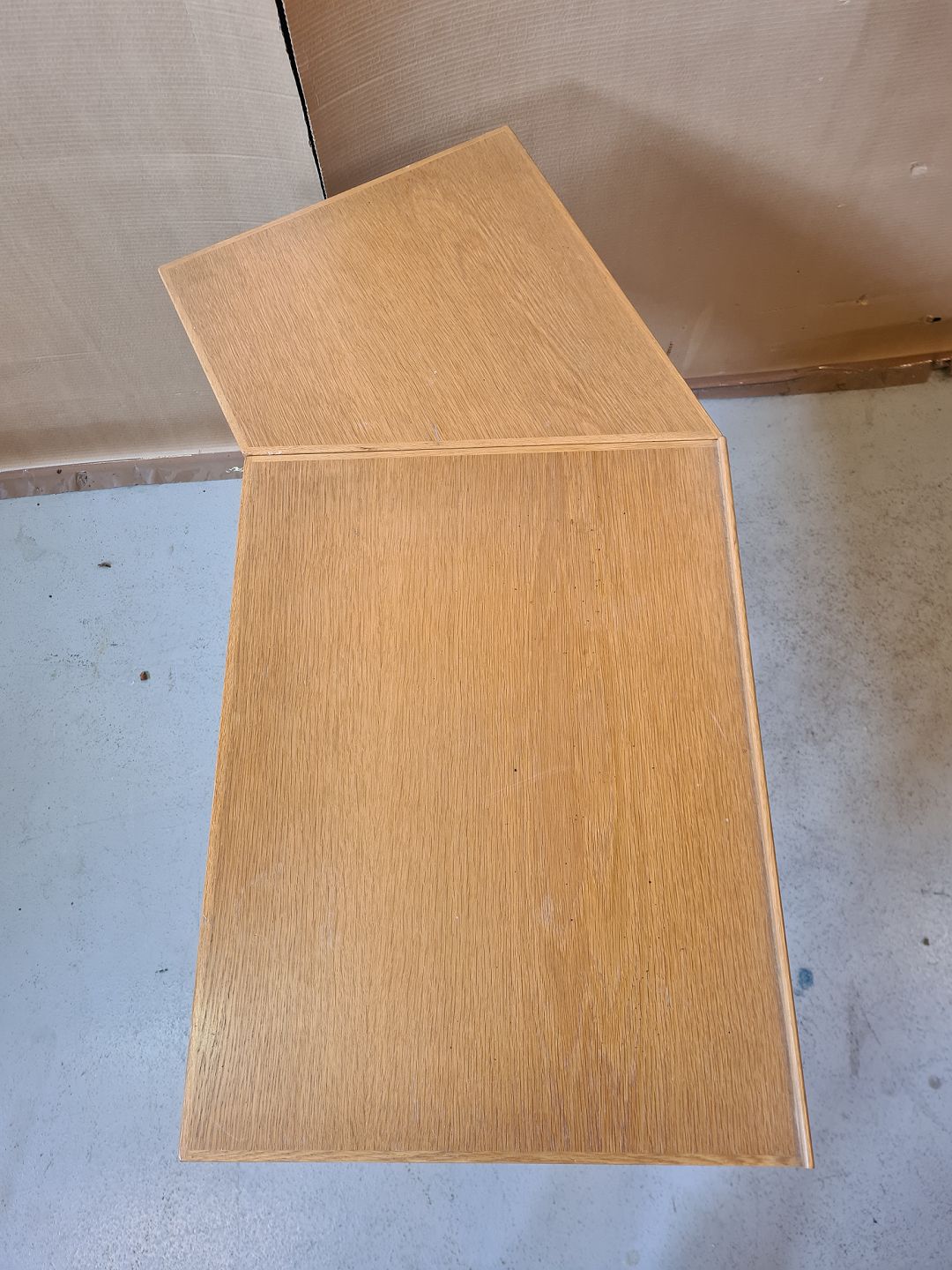 Kontorbord i metal med fineret bordplade i egetræ fra 1970erne.