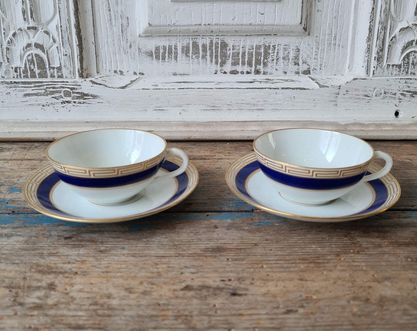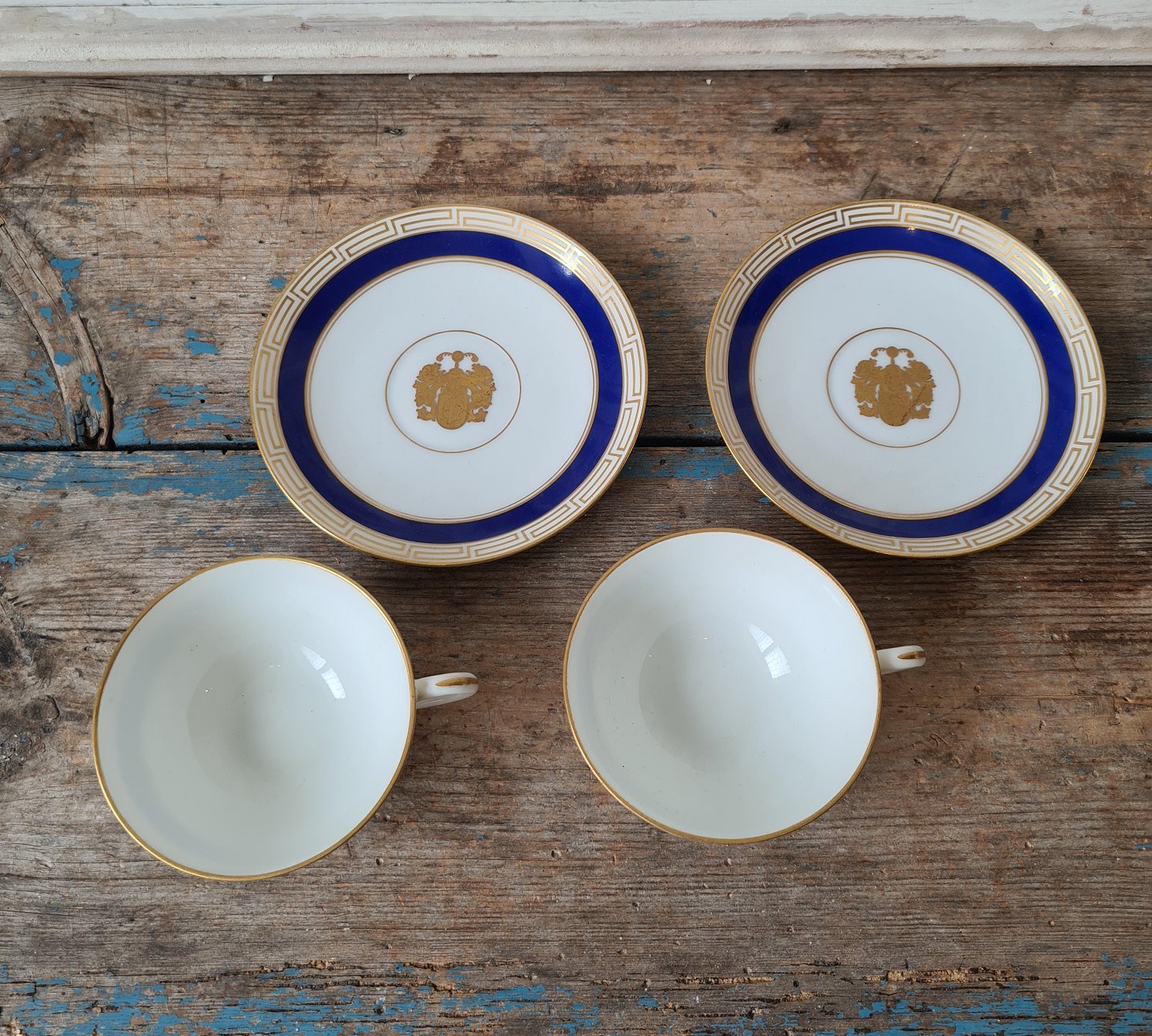 Sæt på 5 B&G små kaffekopper dekoreret med kongeblå fane, græsk evighedsmønster og våbenskjold i guld.