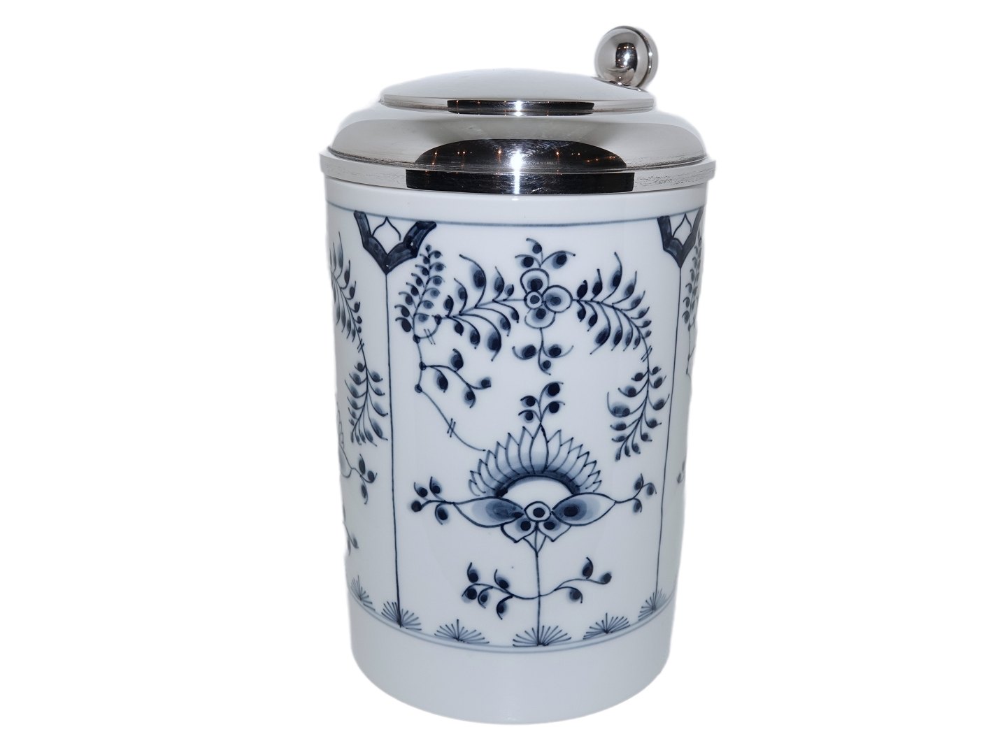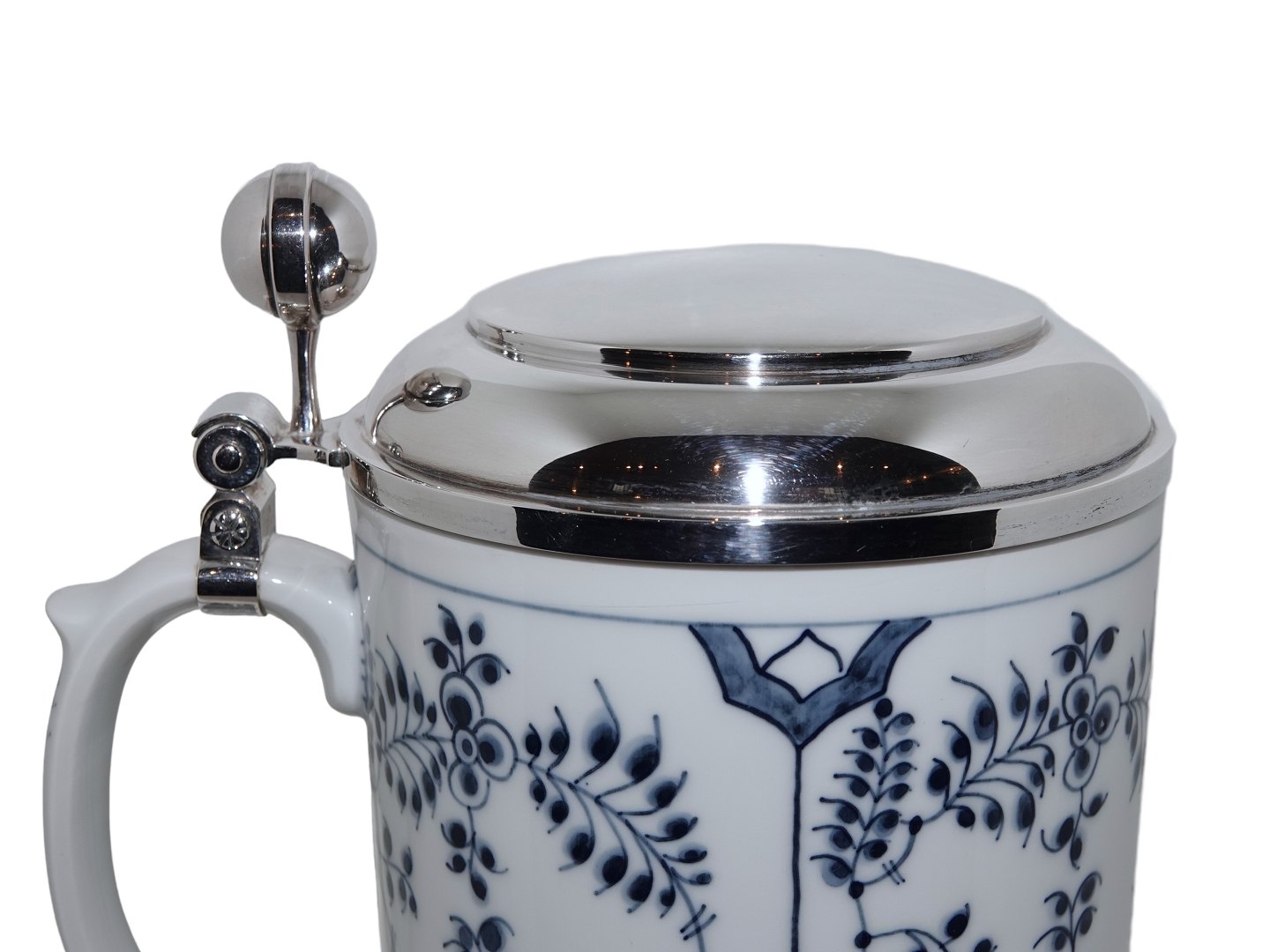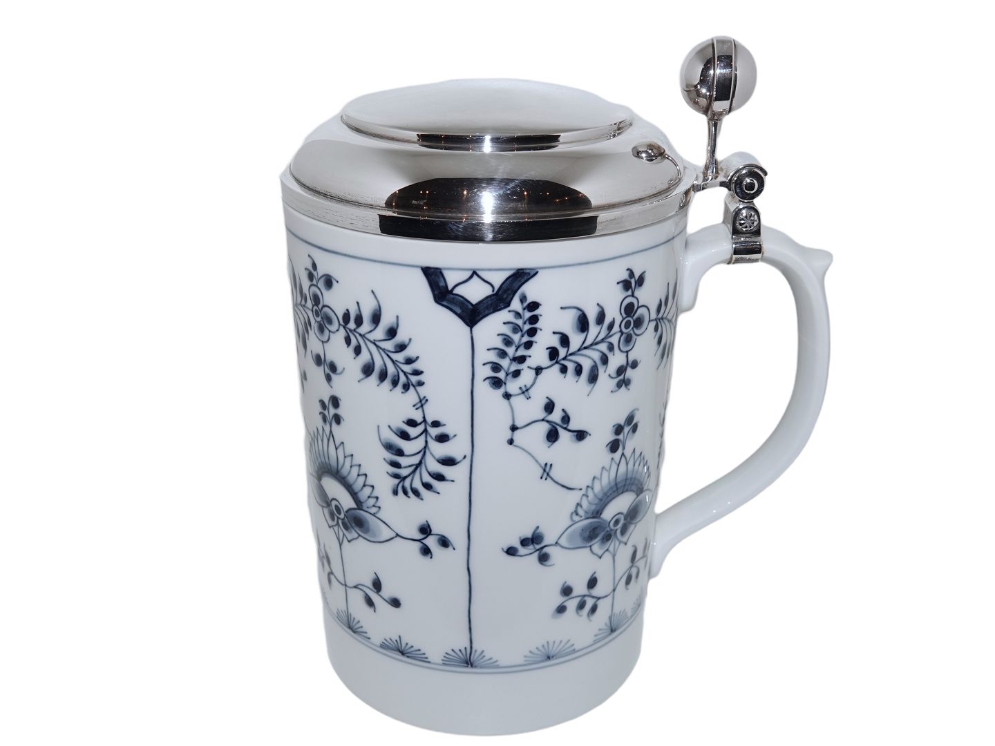 Royal Copenhagen Musselmalet Riflet, sjældent krus i overstørrelse med sterlingsølv låg i flot kraftig kvalitet.