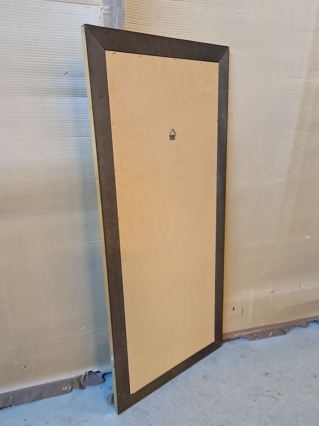 Spejl i fineret egetræ med metalkant, fra 1980erne.