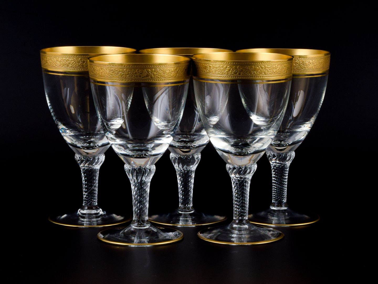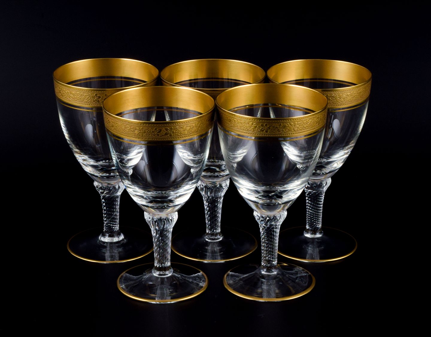 Rimpler Kristall, Zwiesel, Germany, five hand blown crystal red wine glasses with gold rim decorated with grapes and vine leaves.