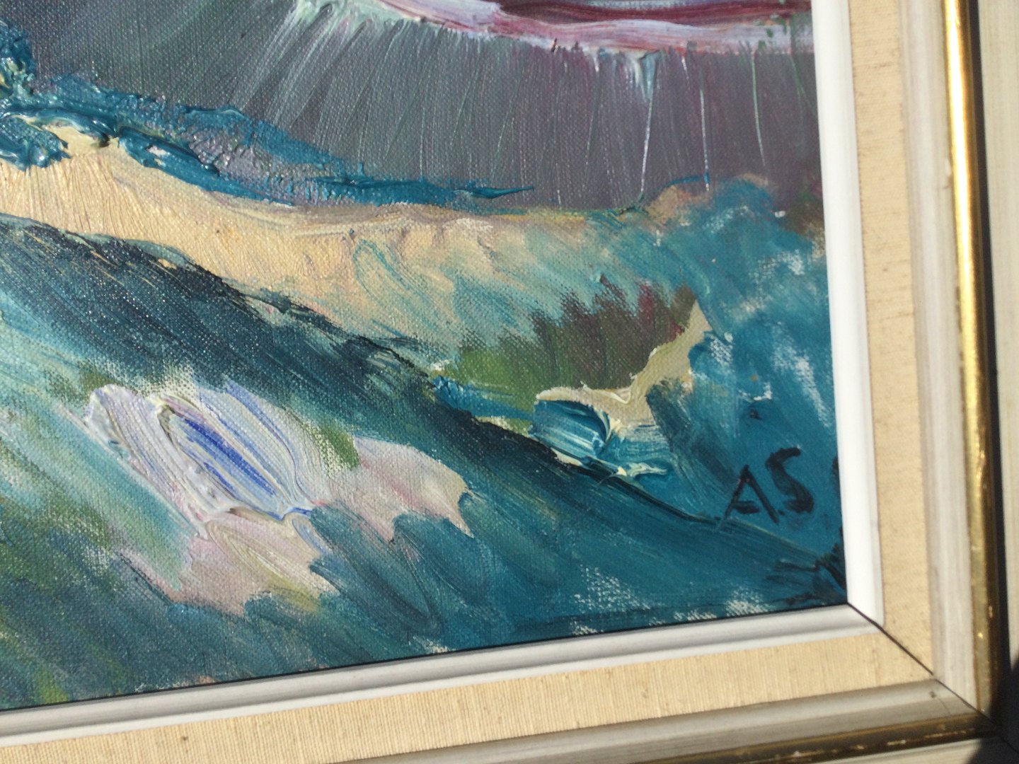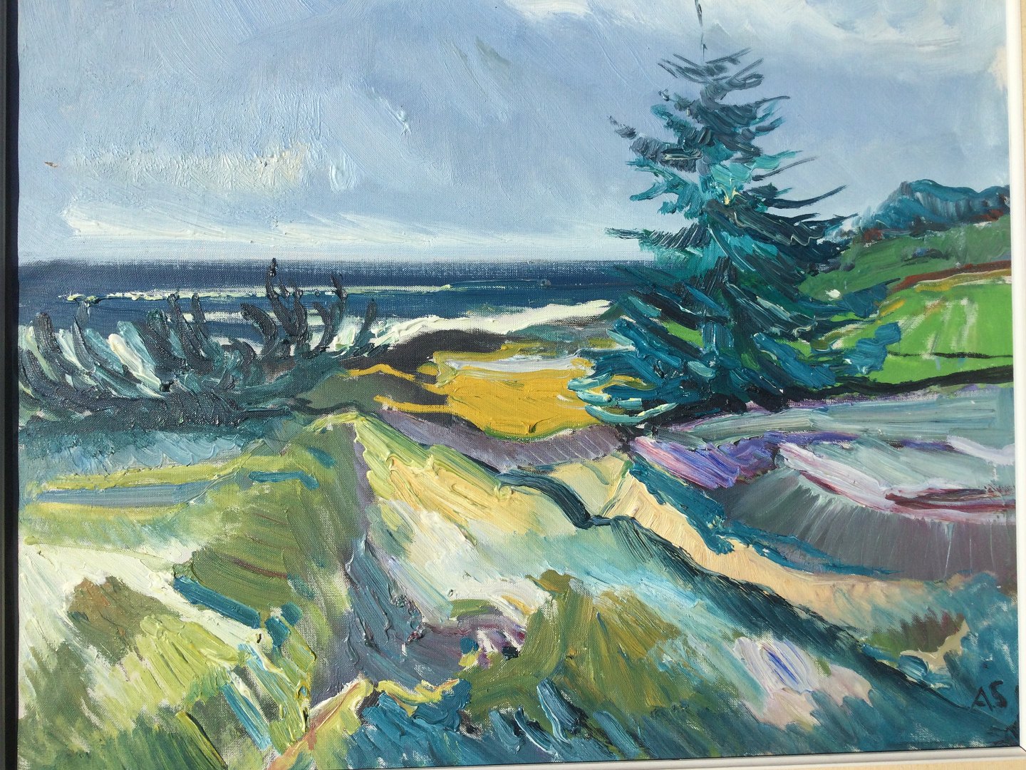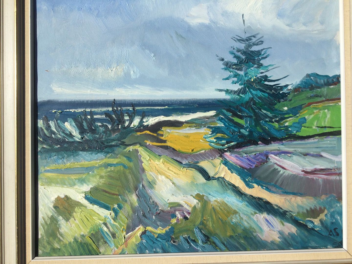 Maleri af Aage Strand - Klitter og graner ved Havet.
