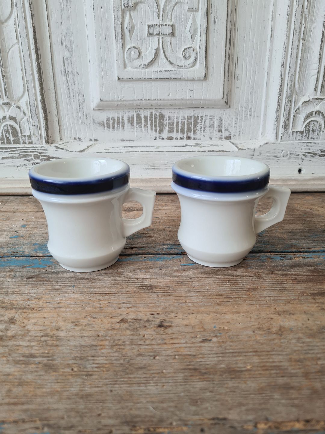 Par franske café brûlot kopper i kraftigt jern porcelæn dekoreret med blå striber