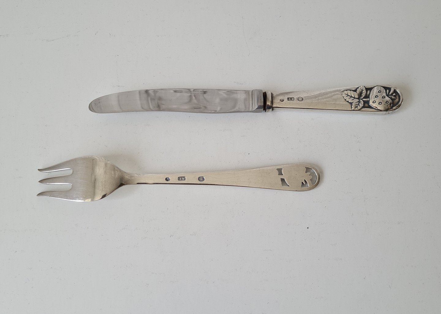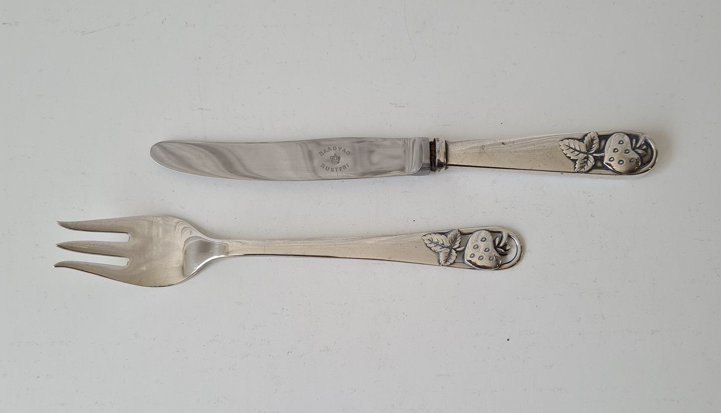 Børne bestik i sølv dekoreret med jordbær