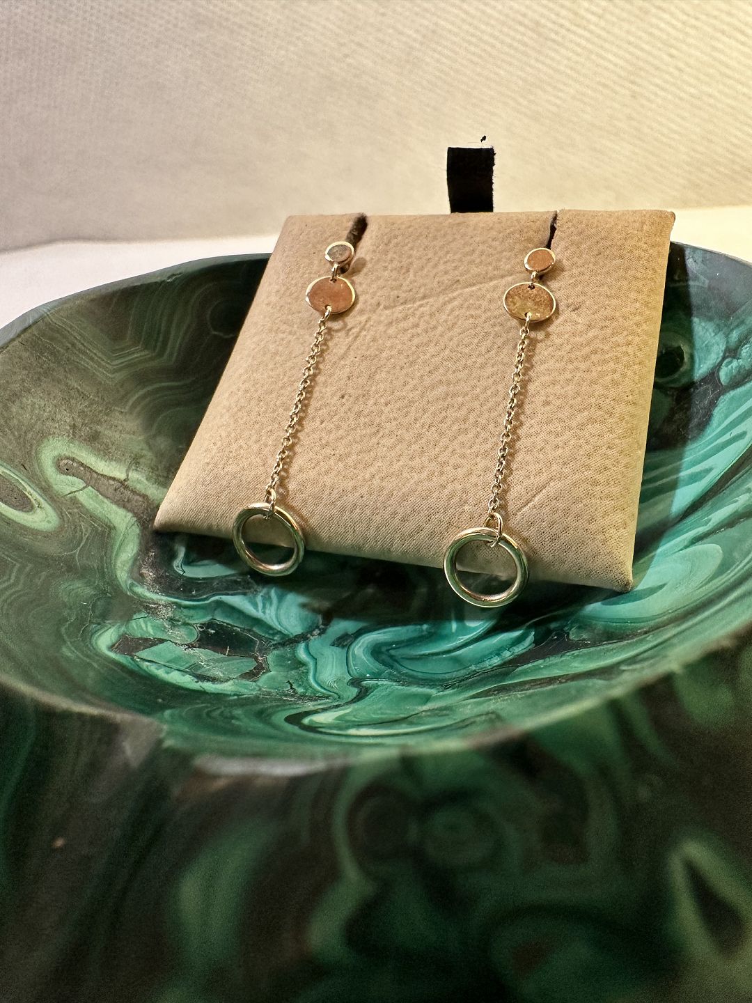 En langt hænger ørering udført i guld 14k