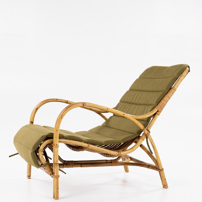 Kurvestol i flettet bambus med ny hynde i Toile Mistral (farve Militaire) fra Pierre Frey.