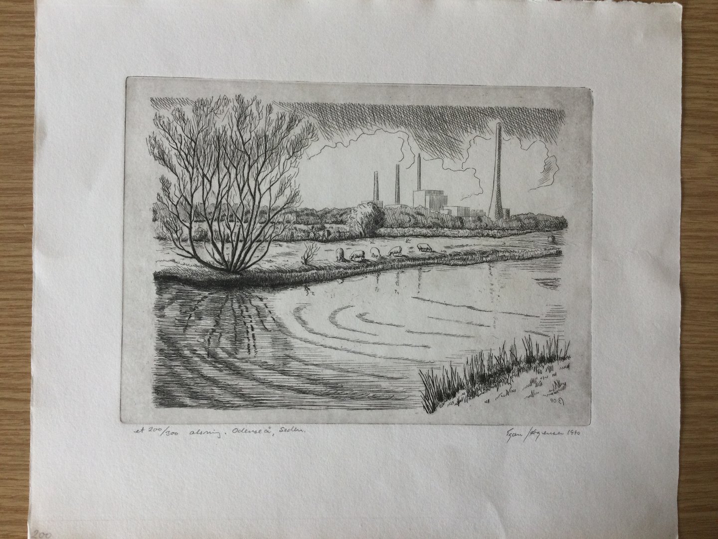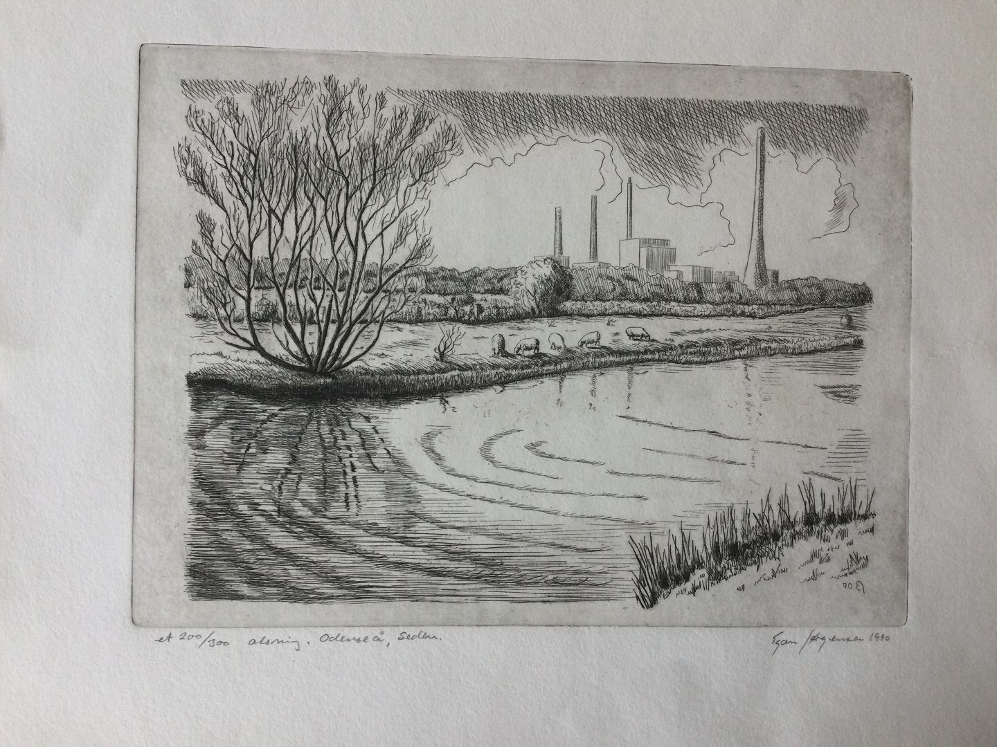 Text available in Danish: Ætsning af Egon Jørgensen 1990 - Fynsværket ved Odense å.