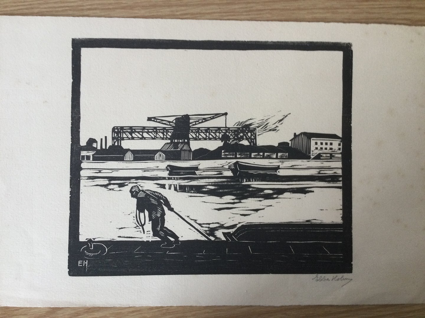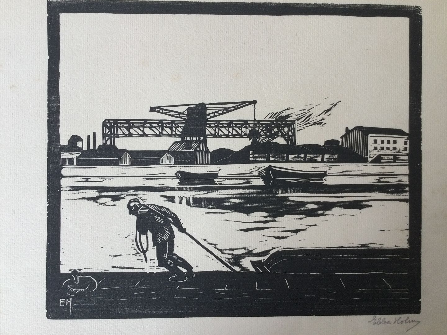 Træsnit af Ebba Holm - Havnemotiv.