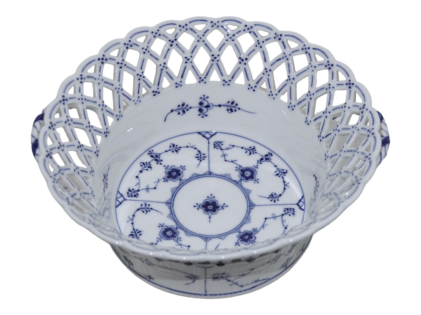 Royal Copenhagen Musselmalet Helblonde, rund frugtskål med hanke.