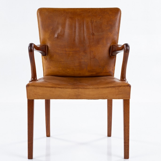 Armchair in solid teak and original, patinated natural leather.