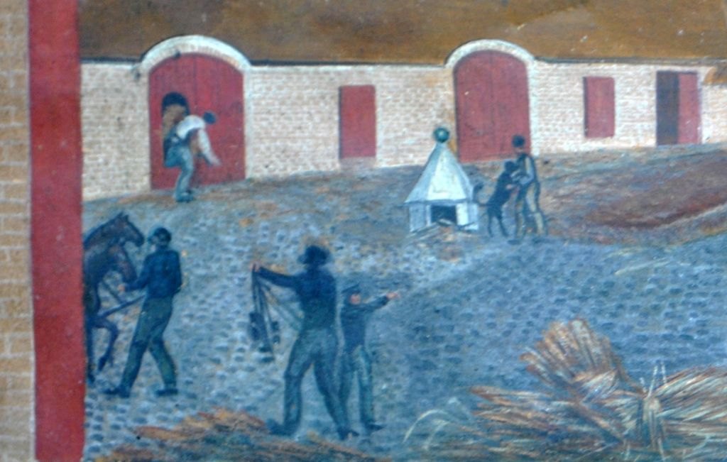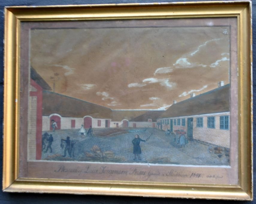Danish artist (19th century): Prospect of Laue Jørgensen Frise's farm in Stubbum. 1841. Pastel on paper. Signed: OMR 1841. 26 x 38 cm. Framed: 32 x 42 cm. Unique source of local history. The village of Stubbum is located a little west of Christianfeld in Southern Jutland. Farmer Laue Jørgensen Friis was born on 2 Sep. 1791 in Aller, Haderslev County. He married Bodil Kirstine Lorentsdatter on 23 August 1817 in Aller. (MyHeritage).