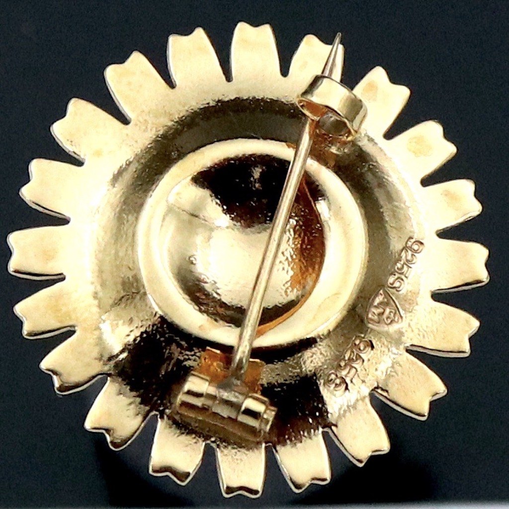 Text zugänglich auf Dänische: A. Michelsen Marguerit / Daisy Broche i forgyldt sterling sølv med turkis emalje - 33mm.
