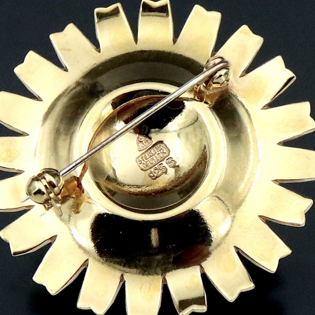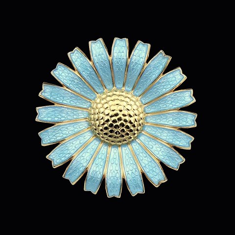 Text zugänglich auf Dänische: A. Michelsen Marguerit / Daisy Broche i forgyldt sterling sølv med turkis emalje - 43mm.