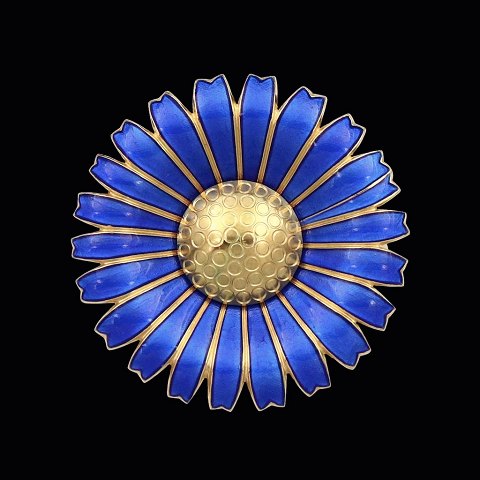 Text zugänglich auf Dänische: Georg Jensen Marguerit / Daisy Broche / Vedhæng i forgyldt sterling sølv med blå emalje - 50mm.