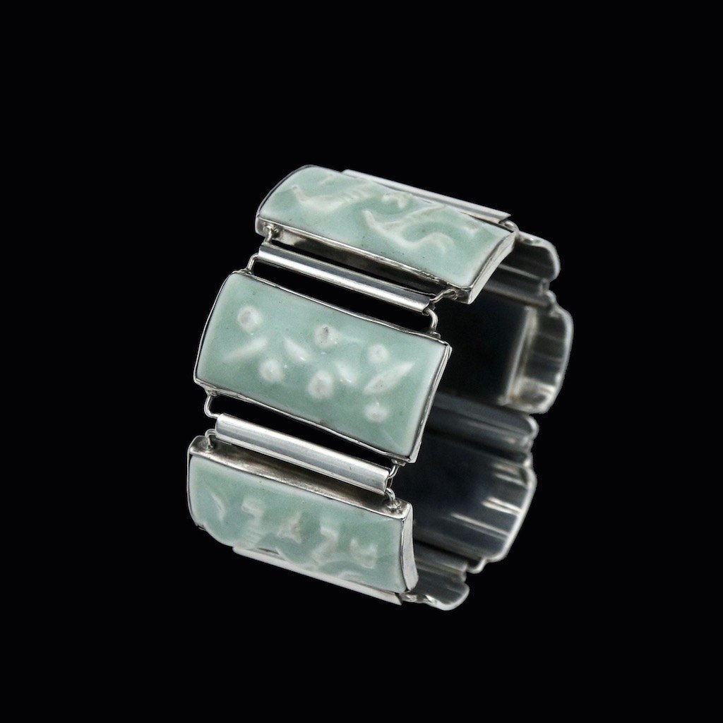 Jais Nielsen 1885-1961. Armbånd i sterling sølv med keramik med celadon glasur.