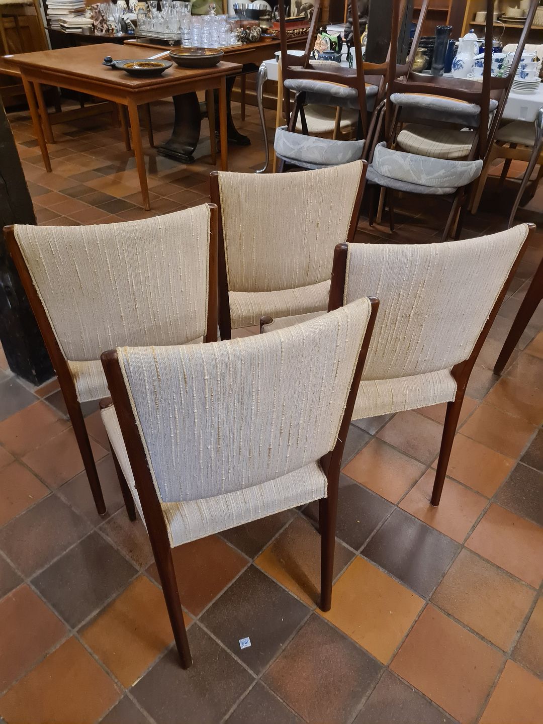 Text available in Danish: Dansk møbelsnedker sæt af 4 stole udført i teak m. messing sko på forben og