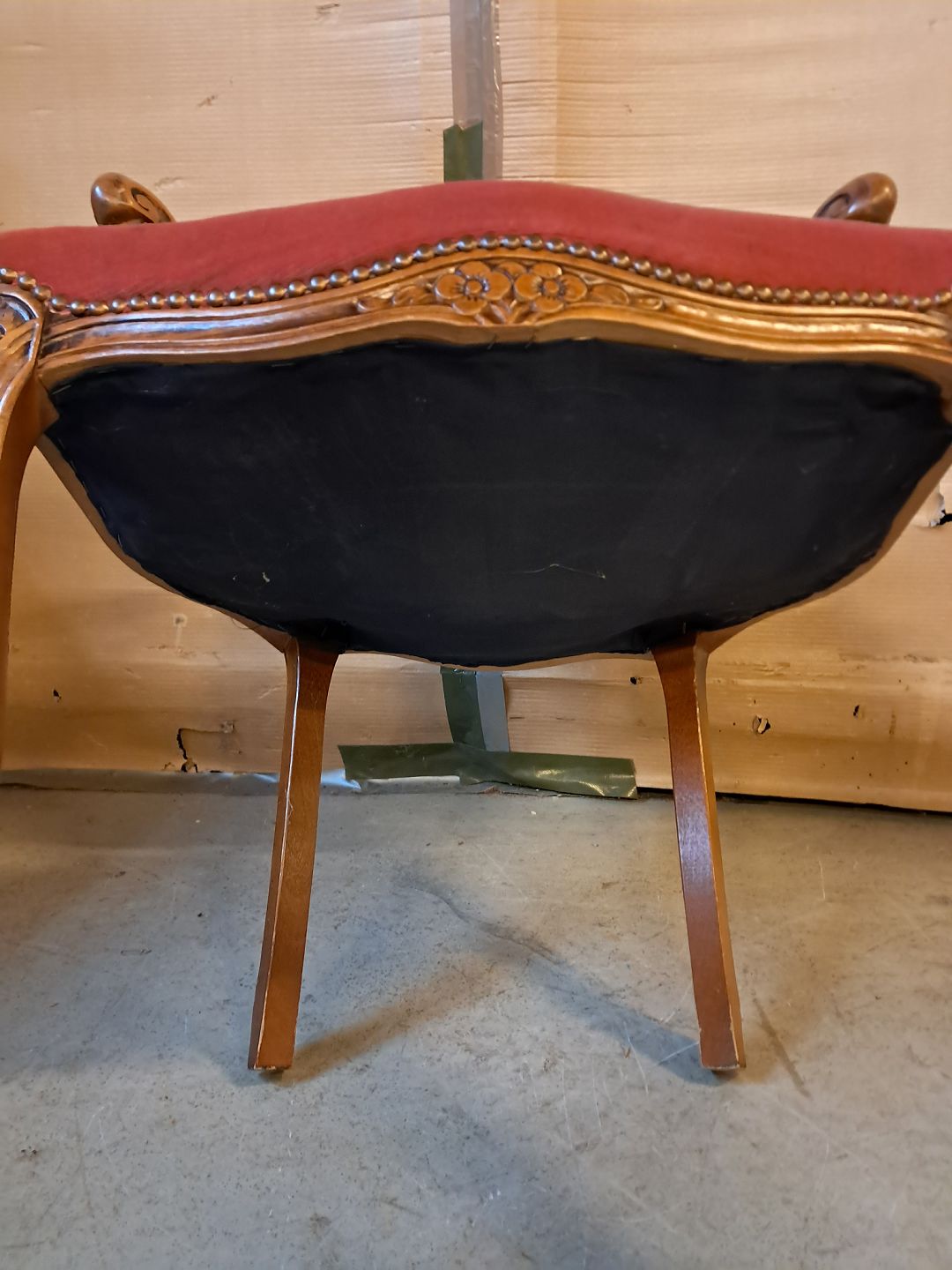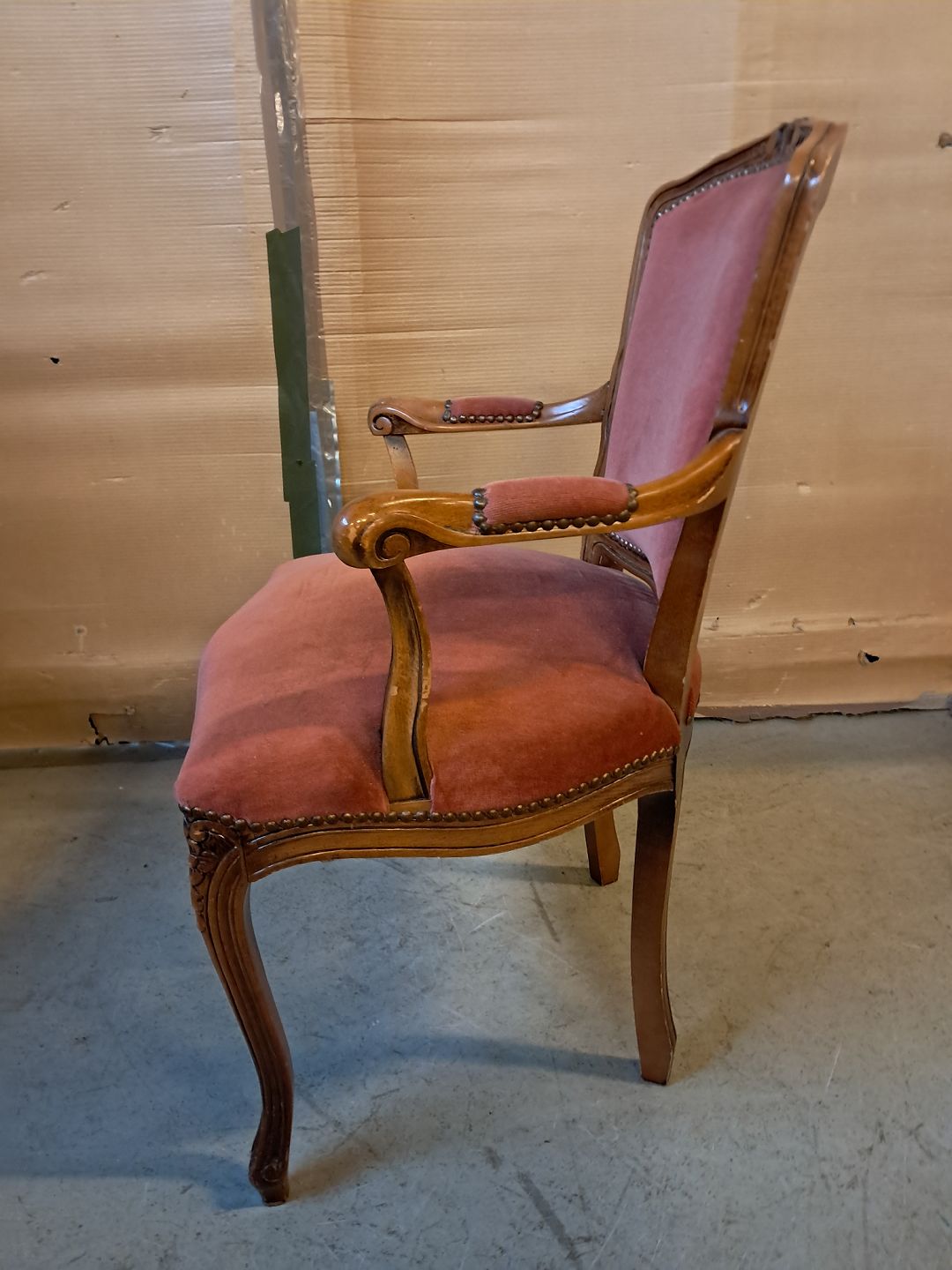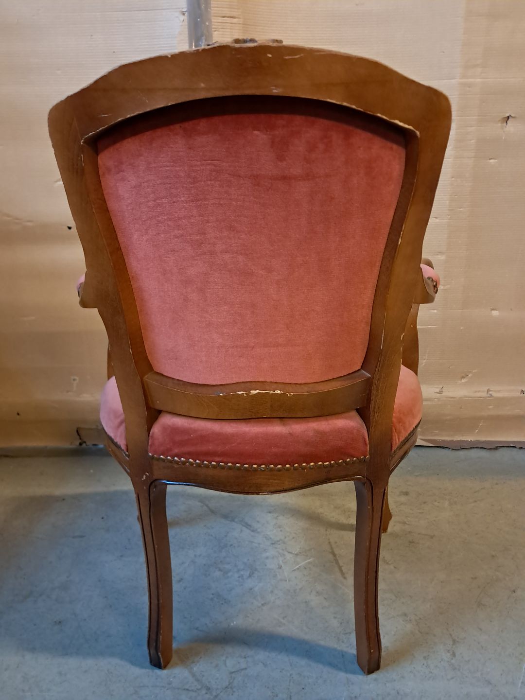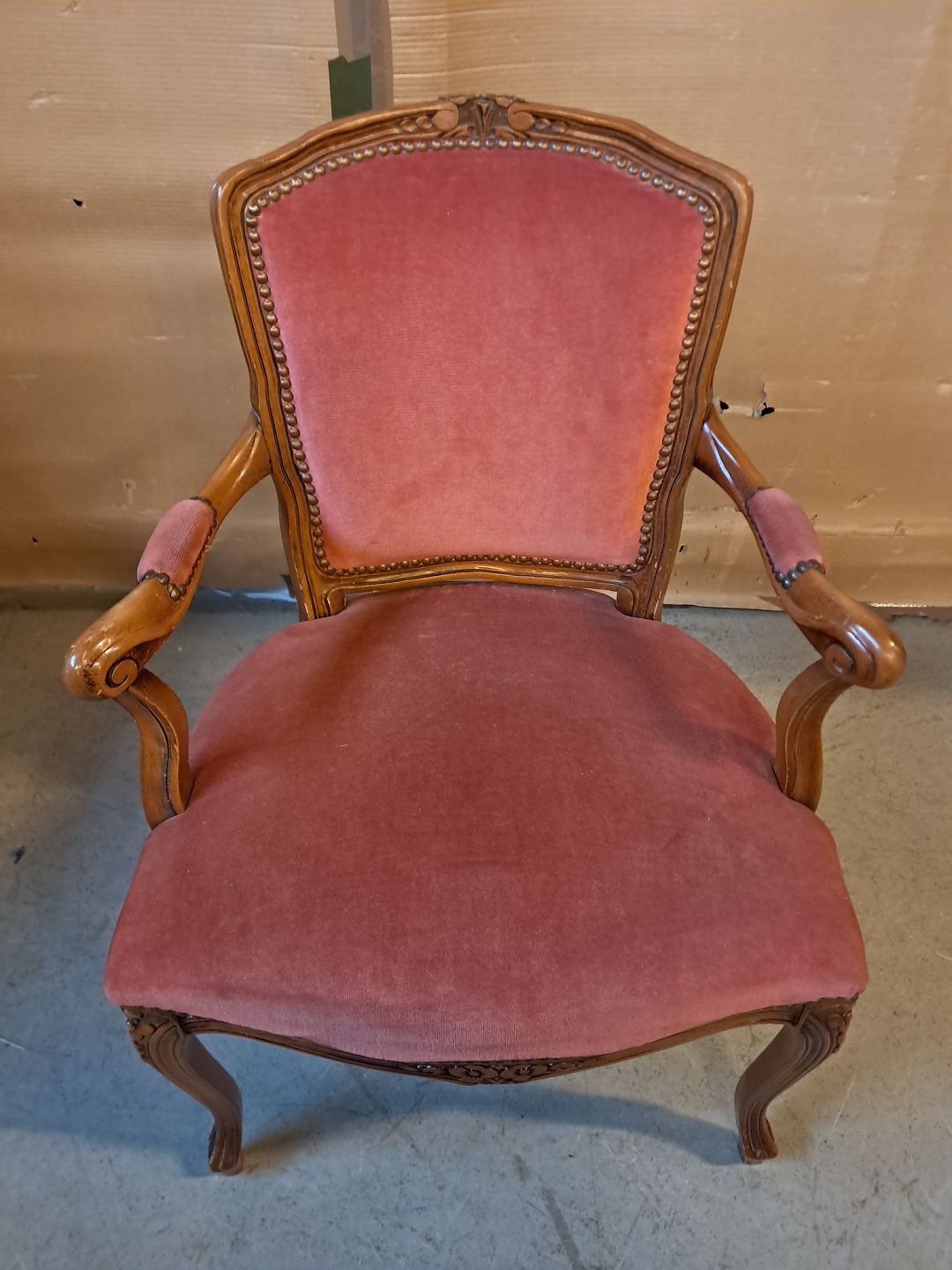 Armstol i massivt bøgetræ med velourbetræk, fra 1980erne.