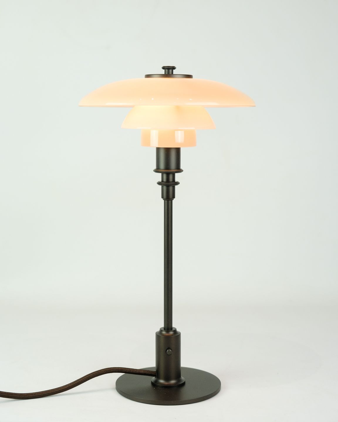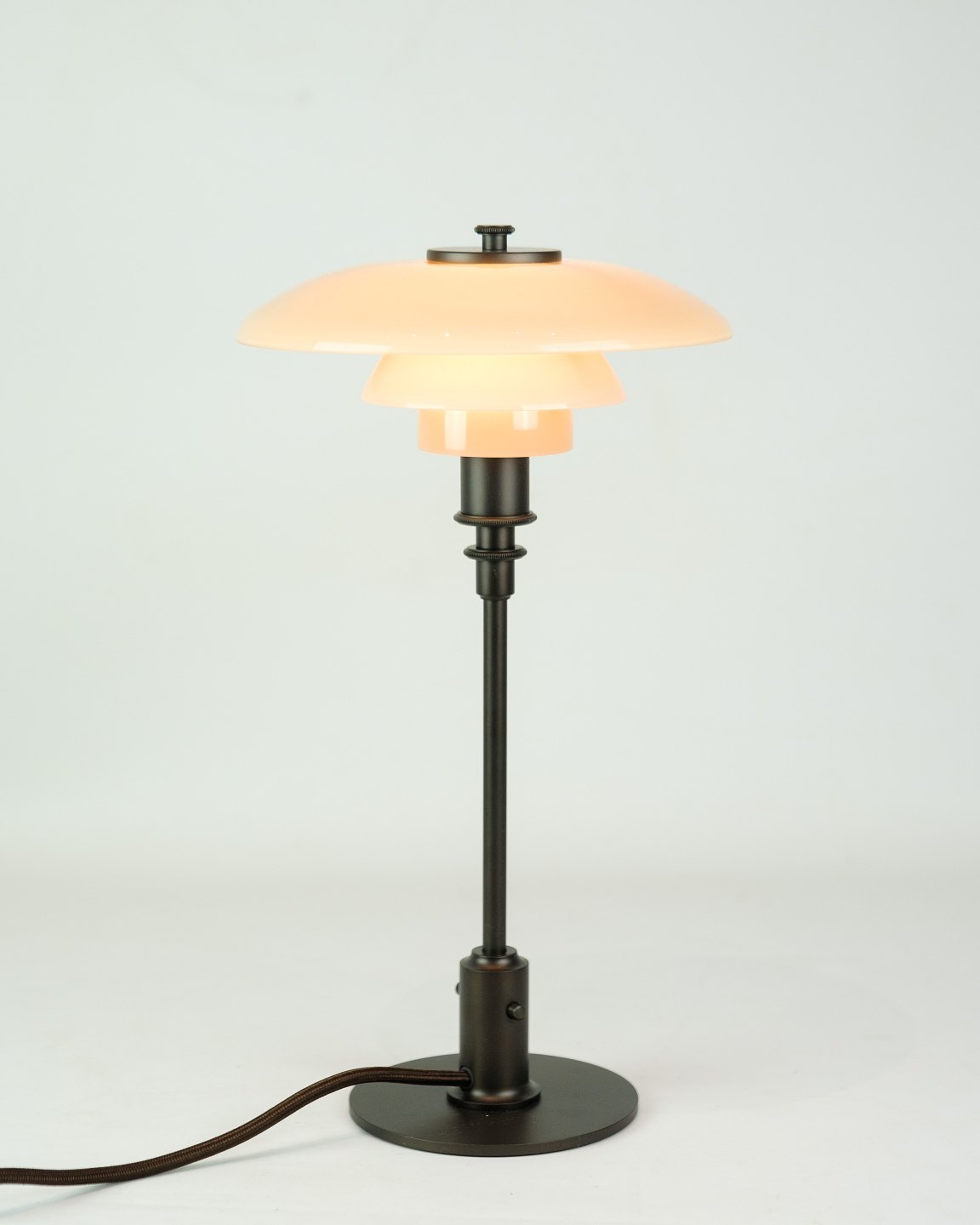 Each lamp is unique due to the handmade shades, which can vary in hue and texture. This model is a tribute to Henningsen's groundbreaking three-shade system from 1925-26, designed to create glare-free and comfortable light. The PH 2/1 table lamp is ideal for adding exclusivity and elegance to any room.