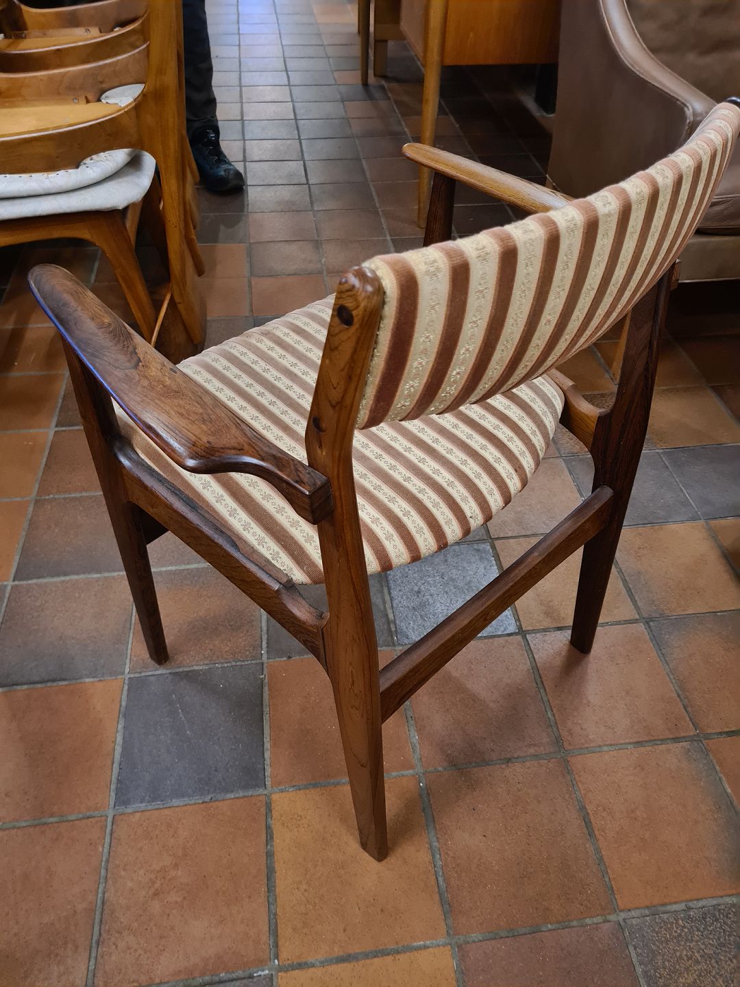 Text available in Danish: Armstol udført i palisander med sæde/ryg betrukket med uldstof.