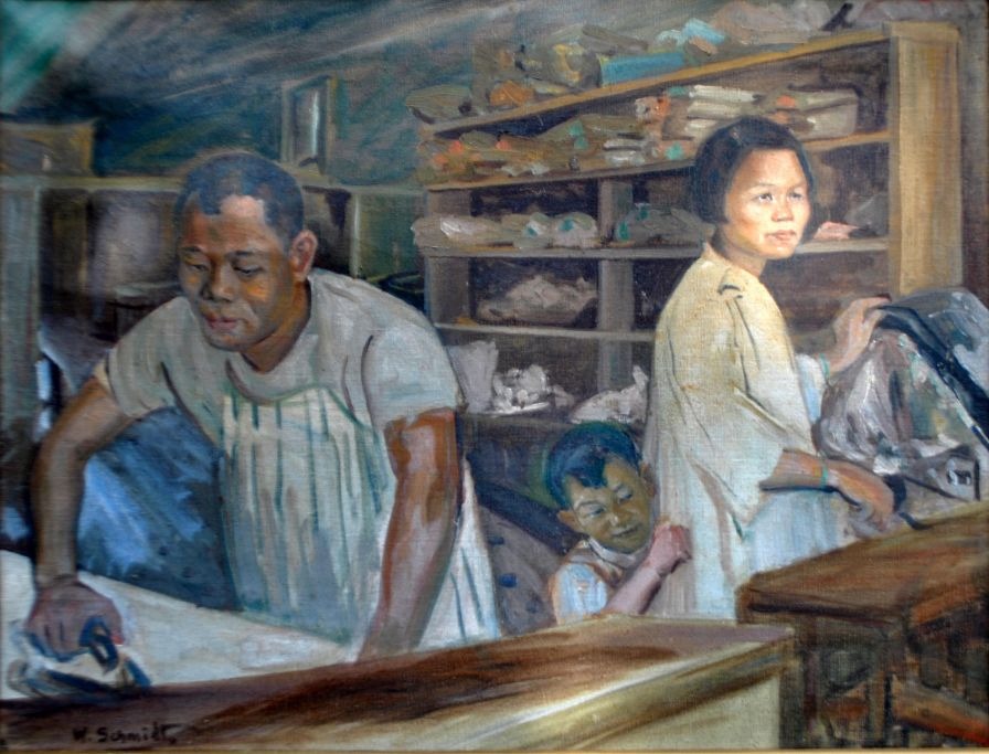 Schmidt, W. (20. årh.): Kinesisk renseri. Olie på lærred. Signeret. H: 56 cm. B: 74 cm.