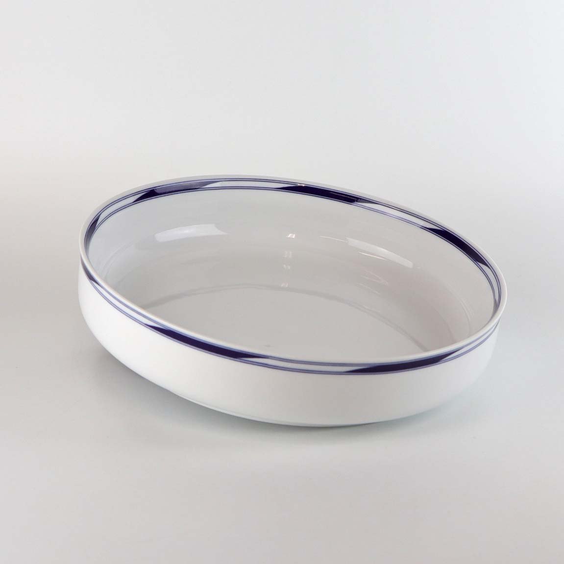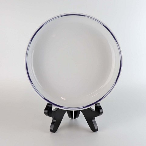 Stel i glat hvidt porcelæn med geometrisk dekoration i mørkeblå streg langs kanten.
