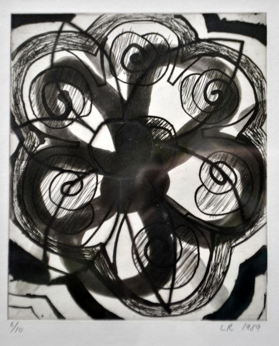 Ravn, Lars (1959 - ) Danmark: Komposition, 1989. Radering. Signeret: LR 1989. 6/10. H: 19,5 cm. B: 17 cm.