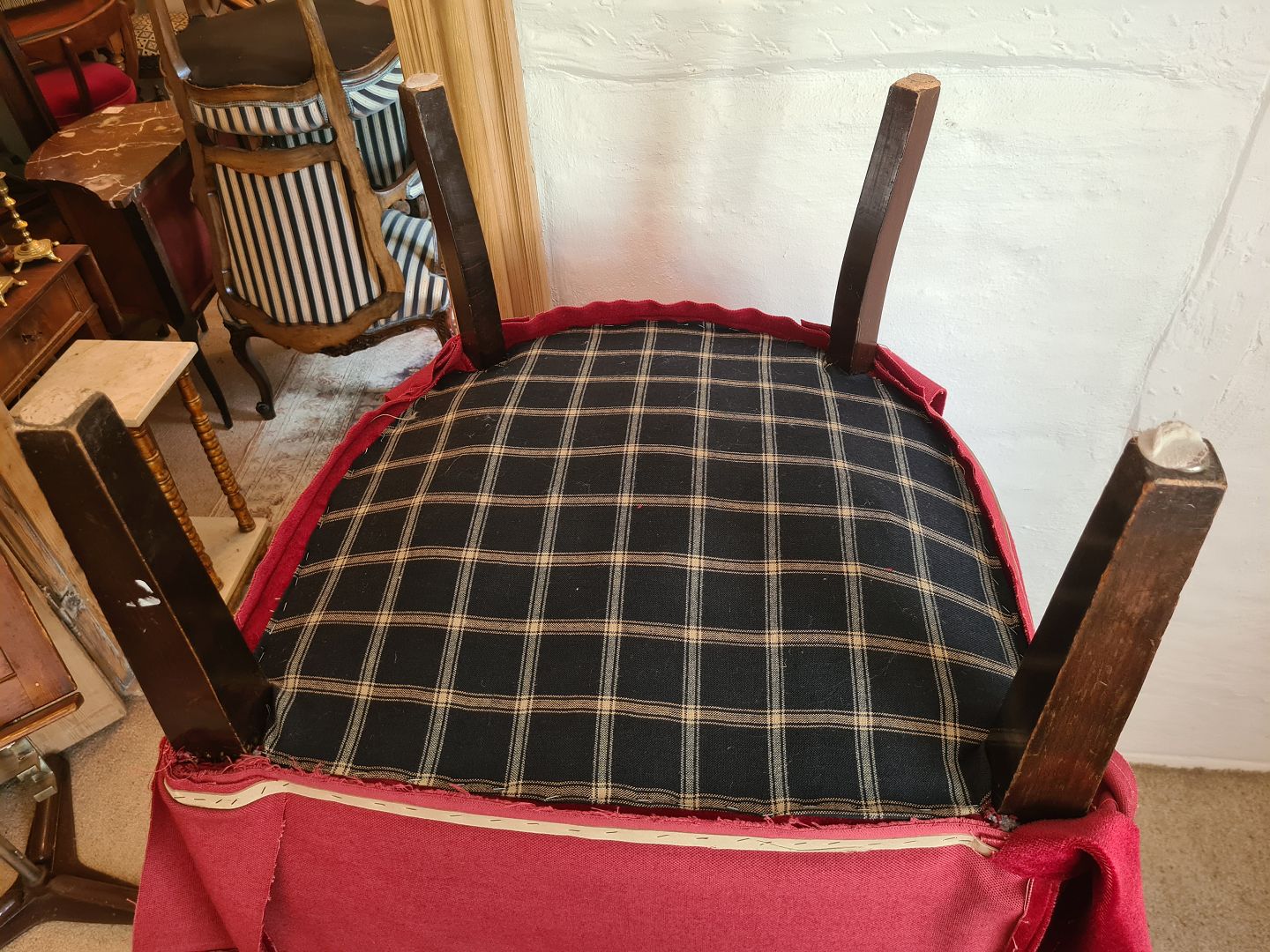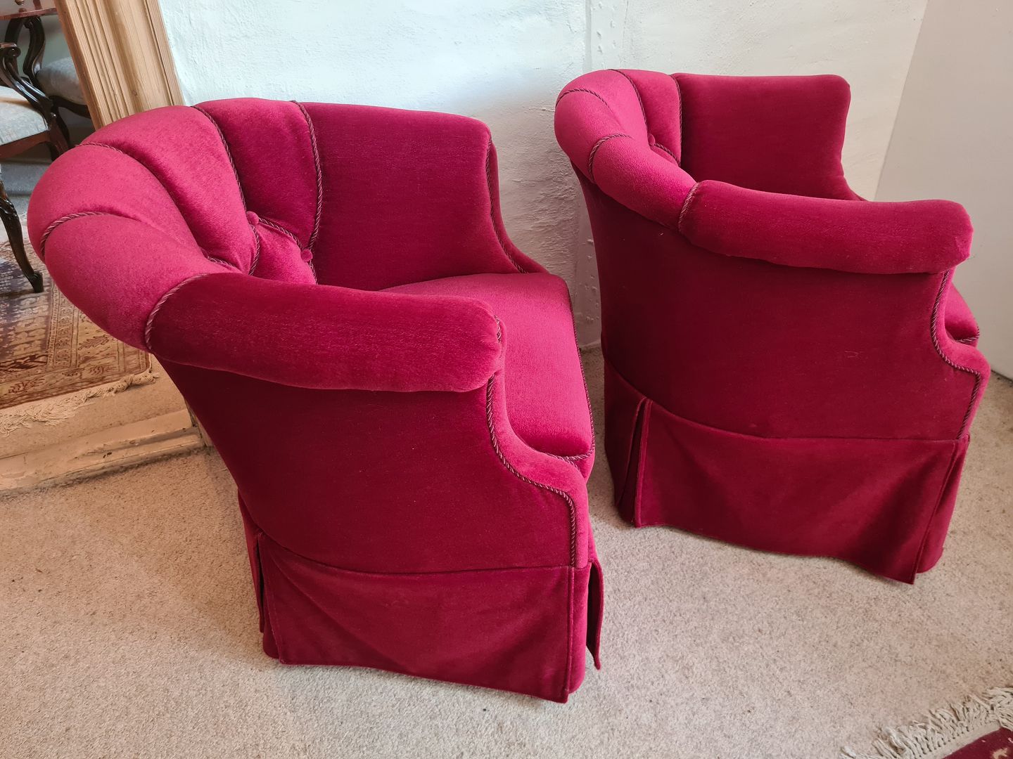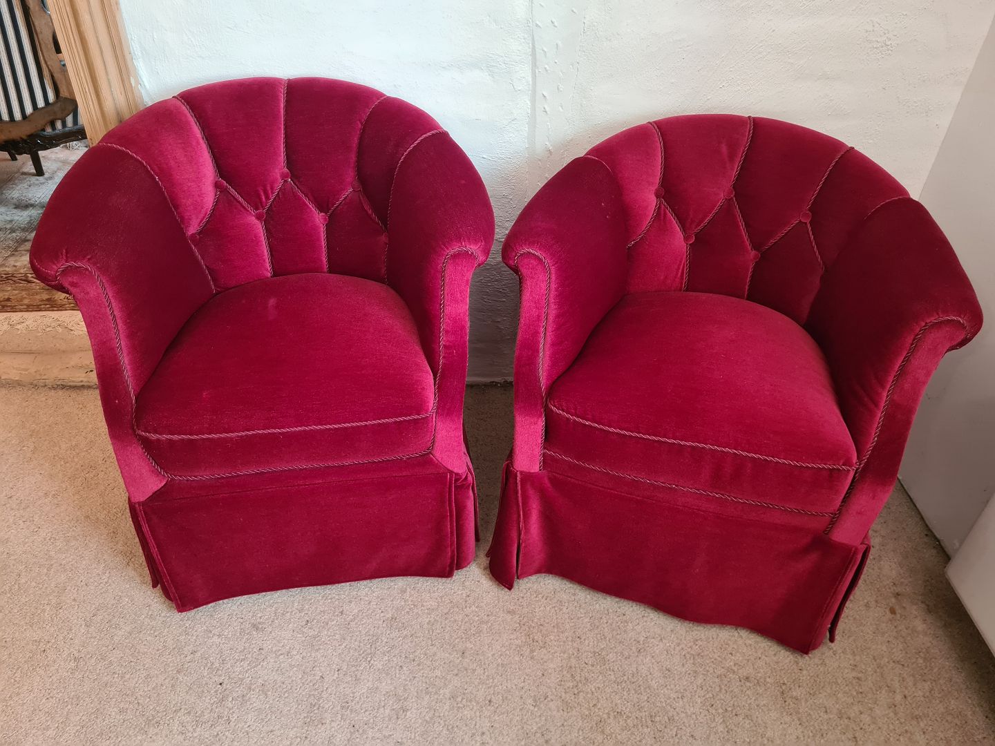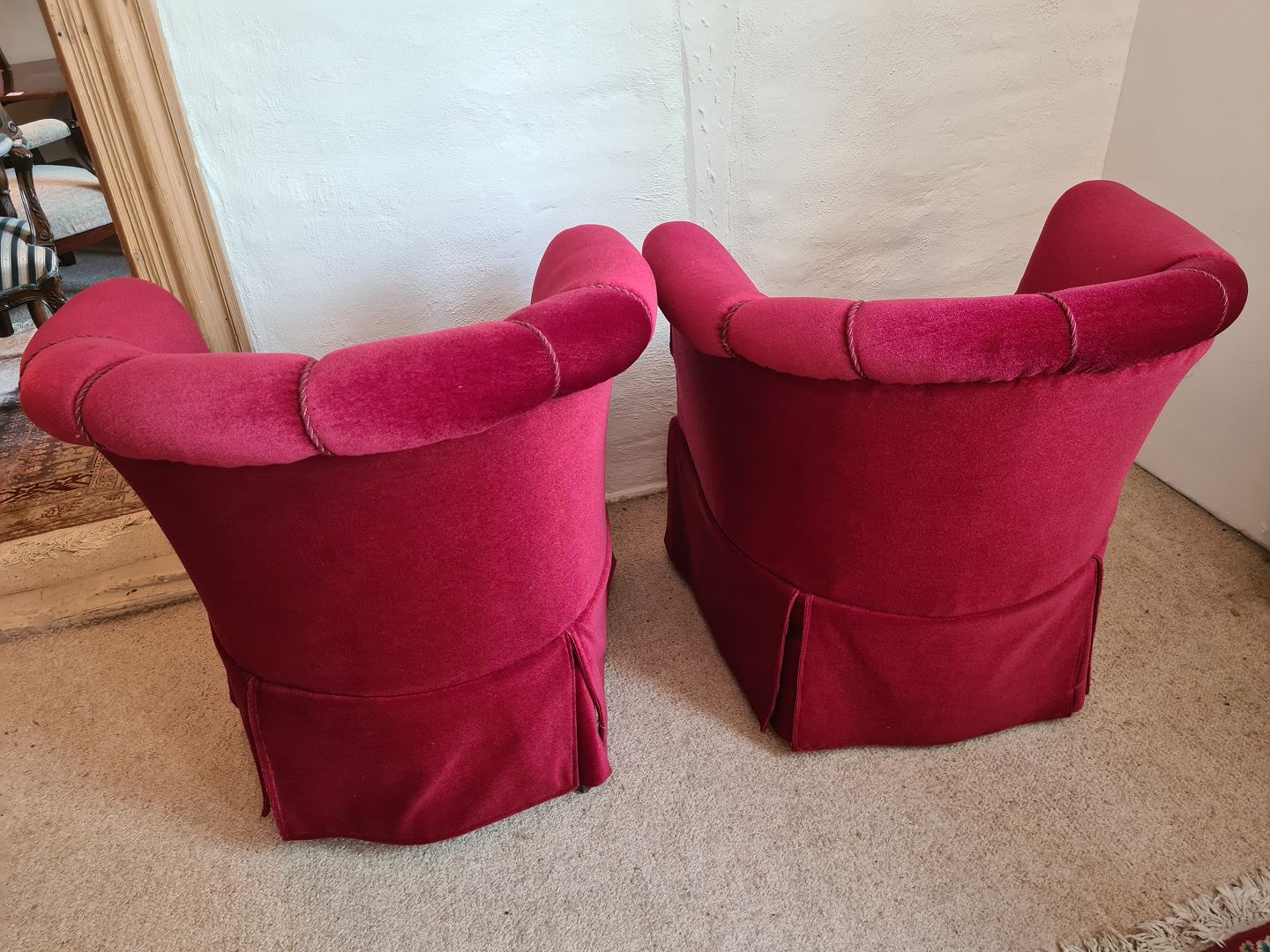 Text zugänglich auf Dänische: Par lænestole fra 1950'erne overbetrukket med rødt velour. Fremstår pæne og velholdte uden nævneværdige brugsspor.