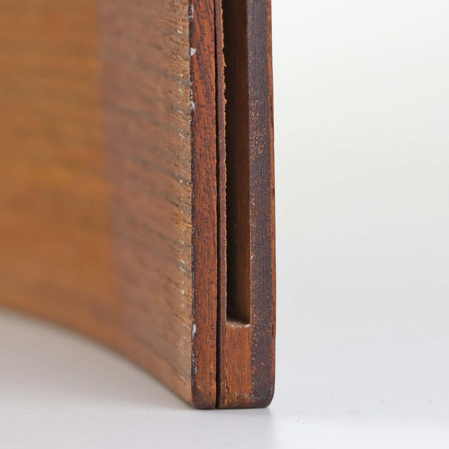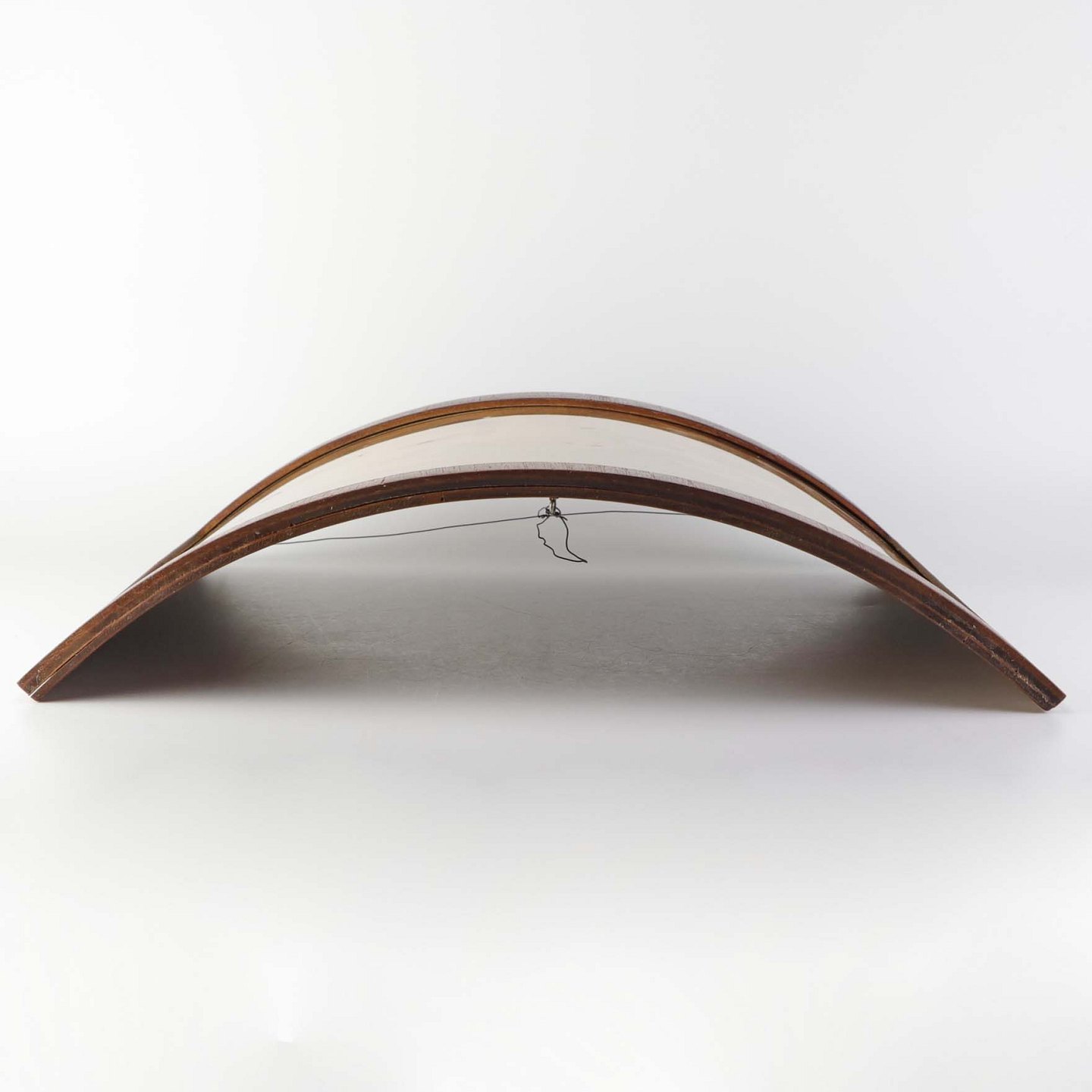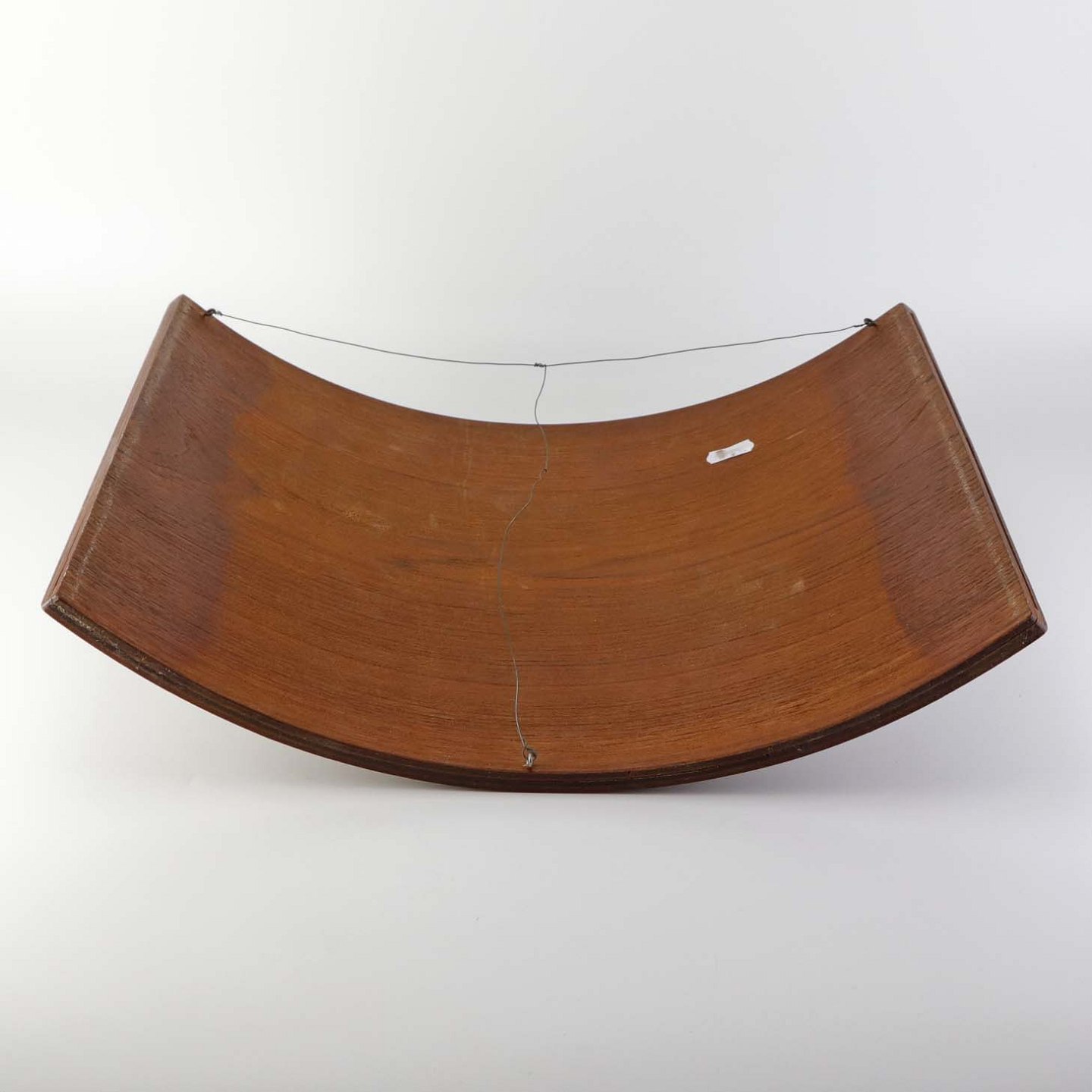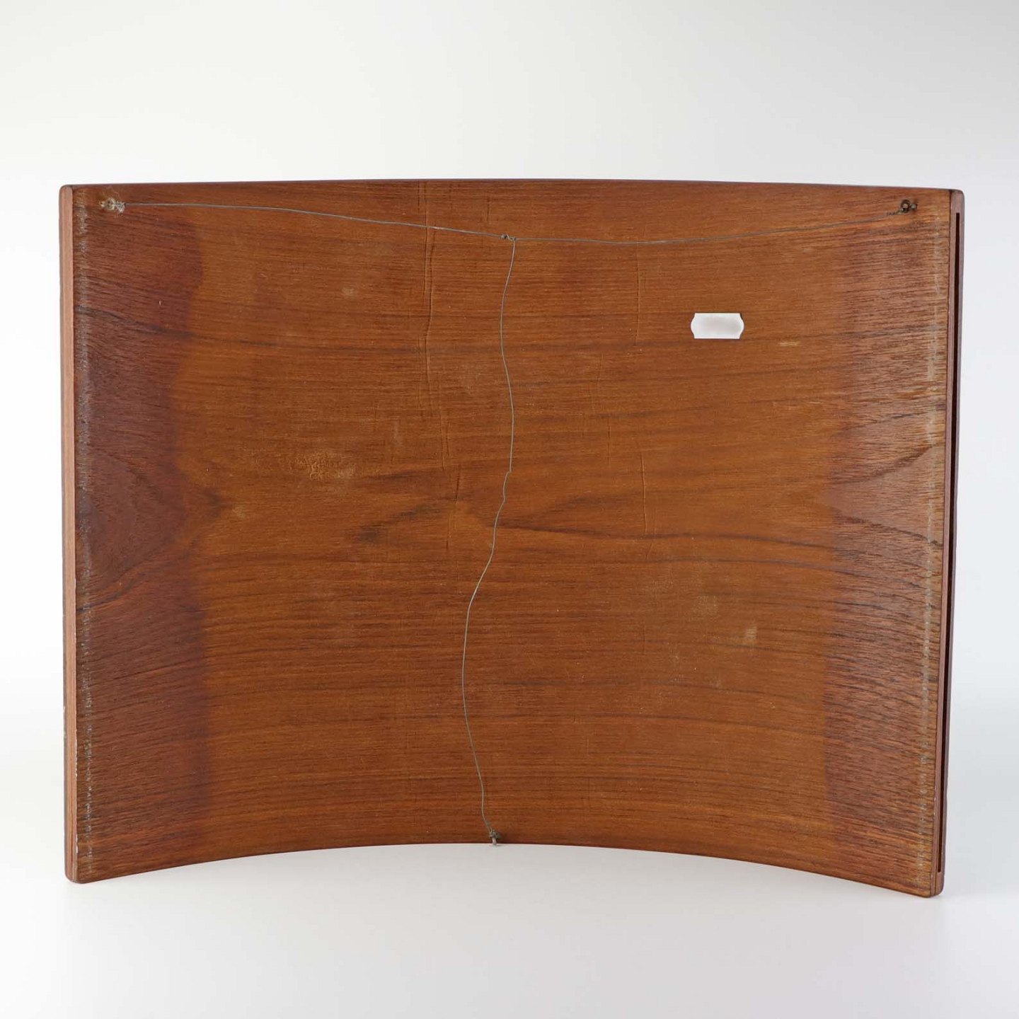Indrammet tryk bag blødt past i buet ramme i teaktræsfiner. Trykket er med motiv fra frisørsalon.