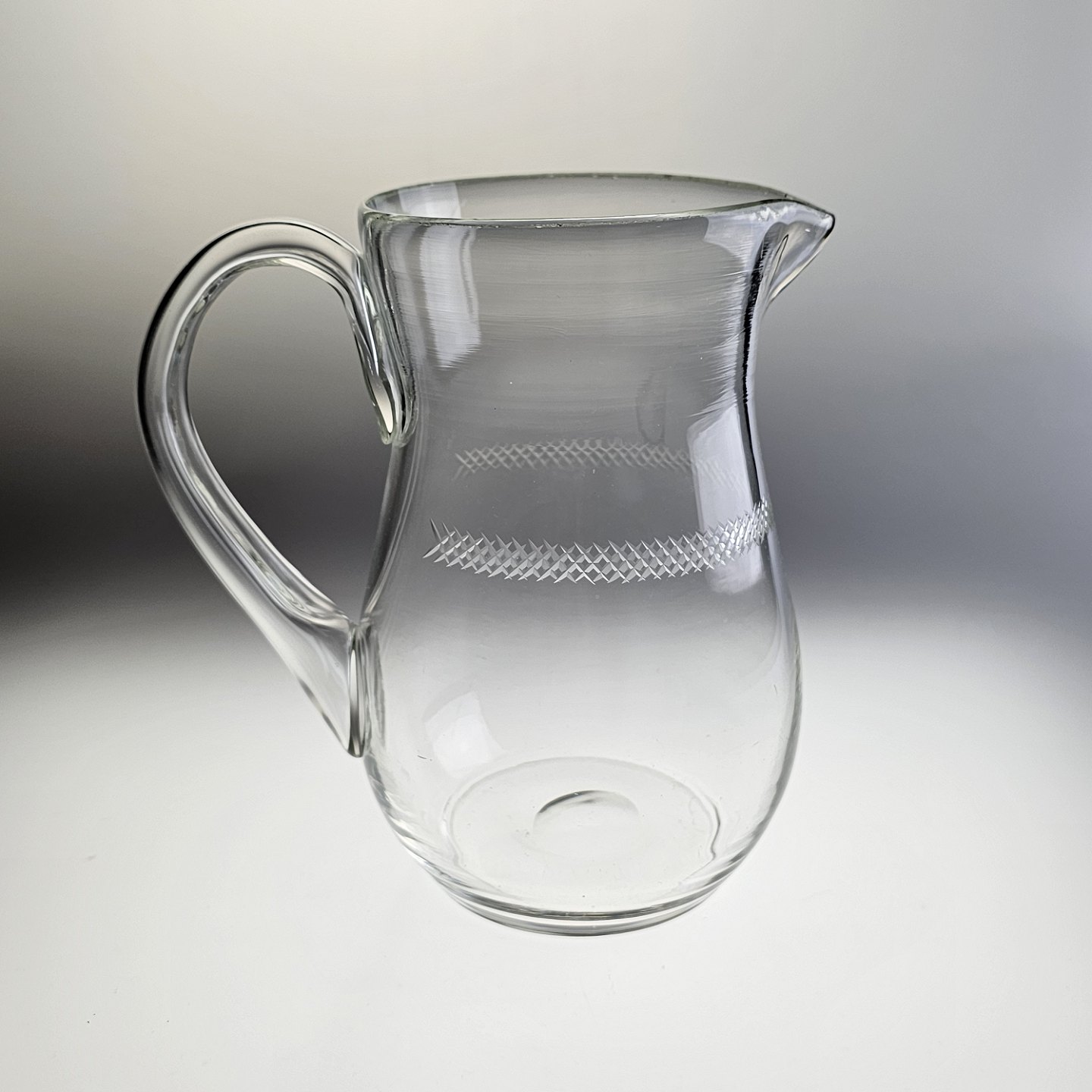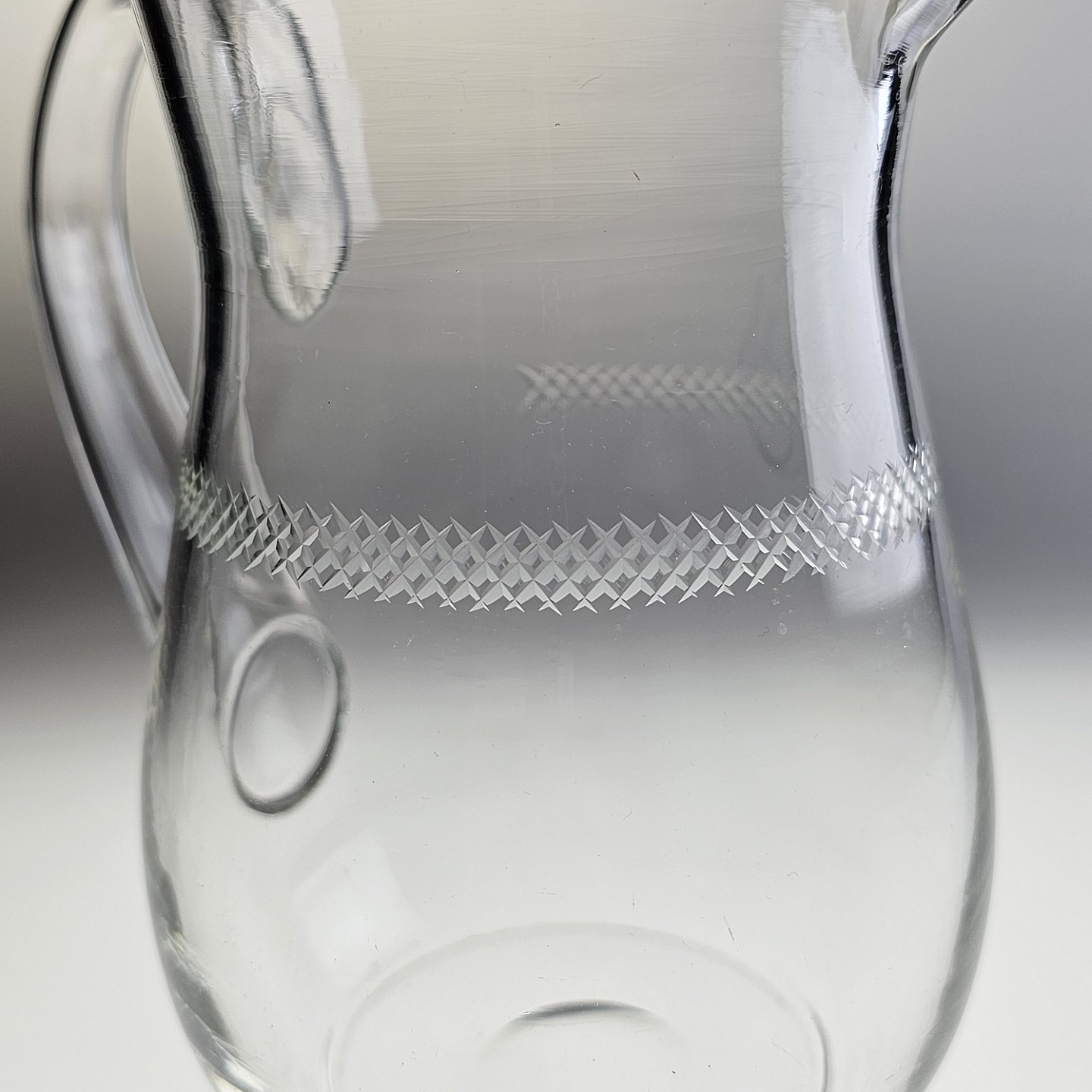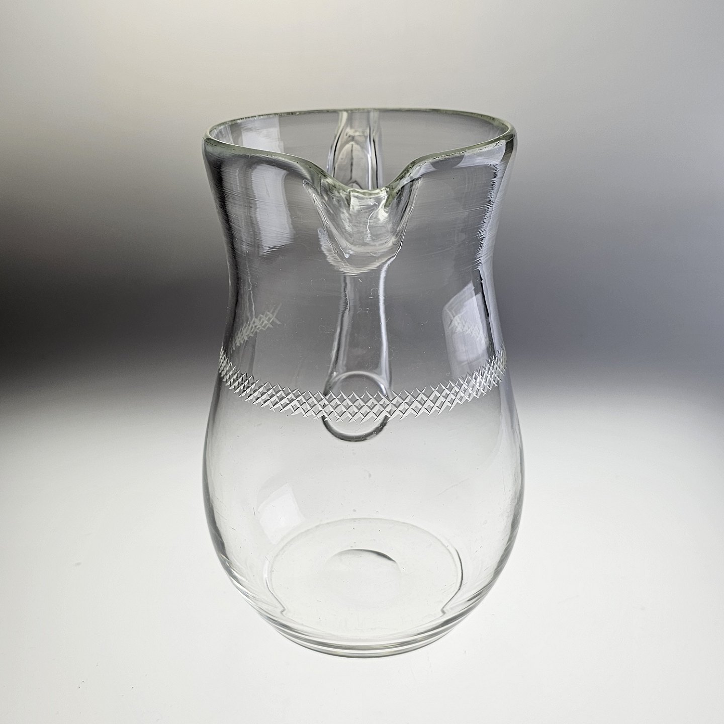 Mundblæst glaskande med krydsslibninger. Tilhørende glasstellet krydslebne med baluster stilk