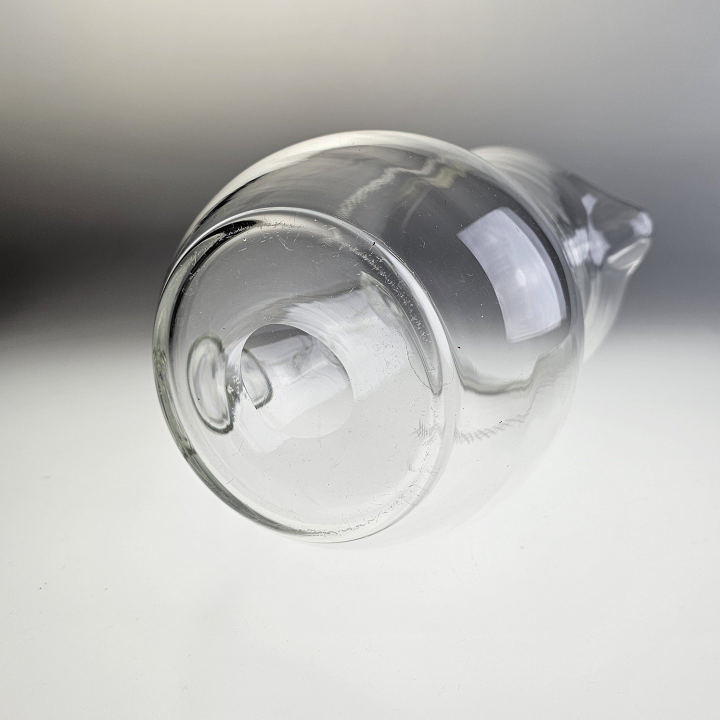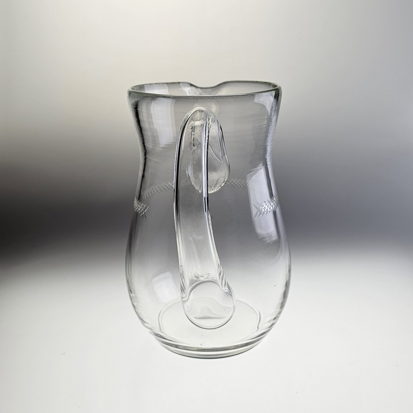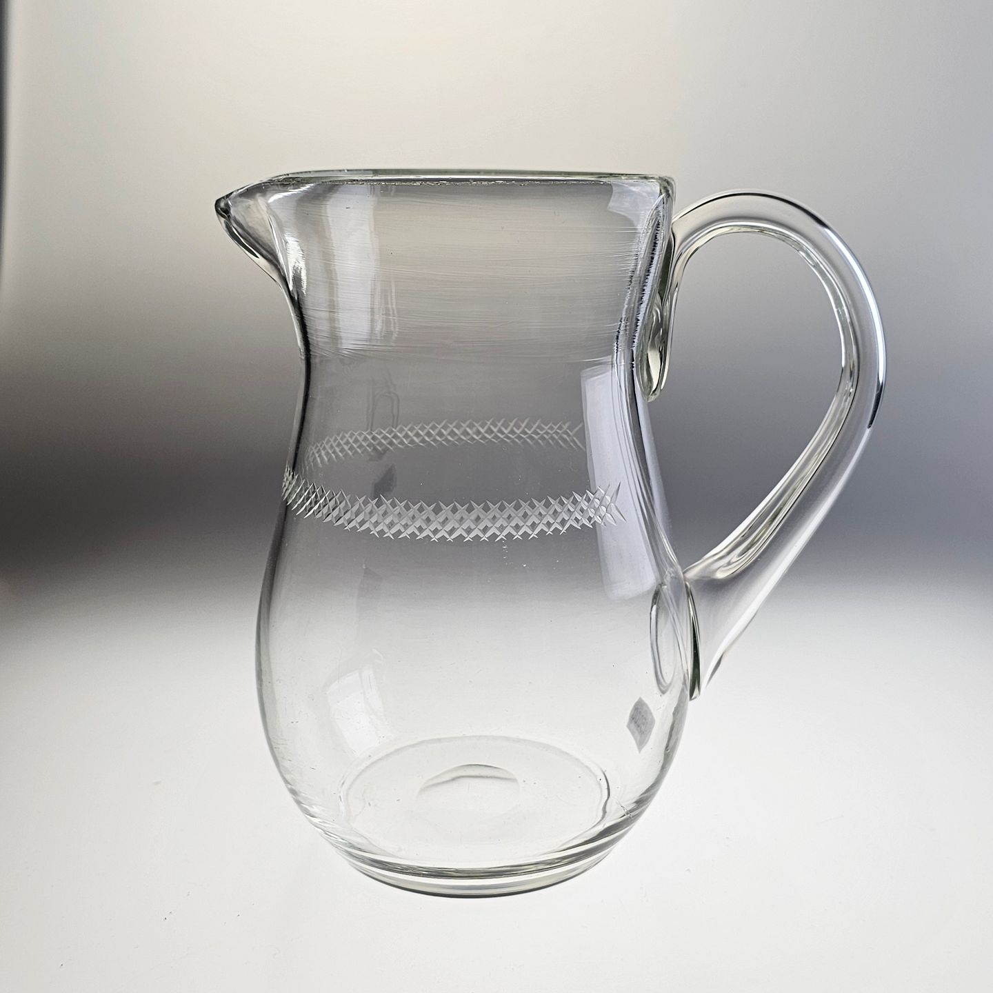 Mundblæst glaskande med krydsslibninger. Tilhørende glasstellet krydslebne med baluster stilk