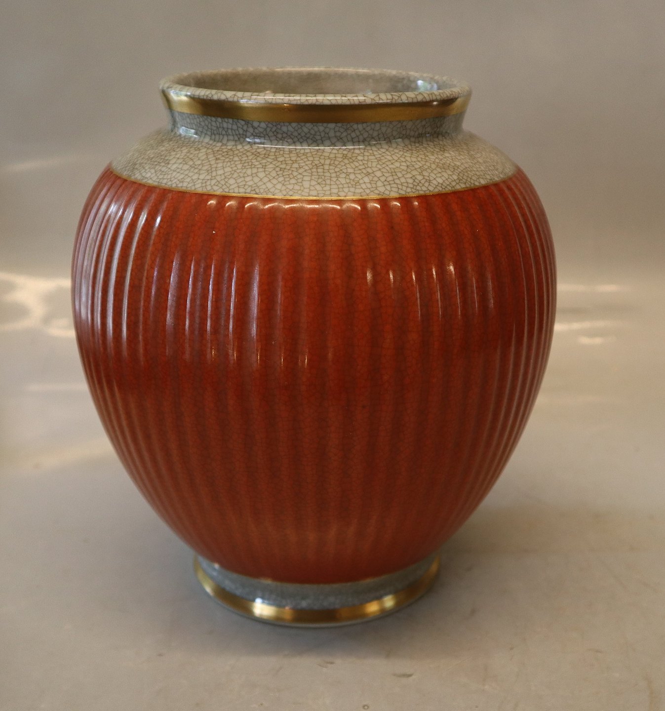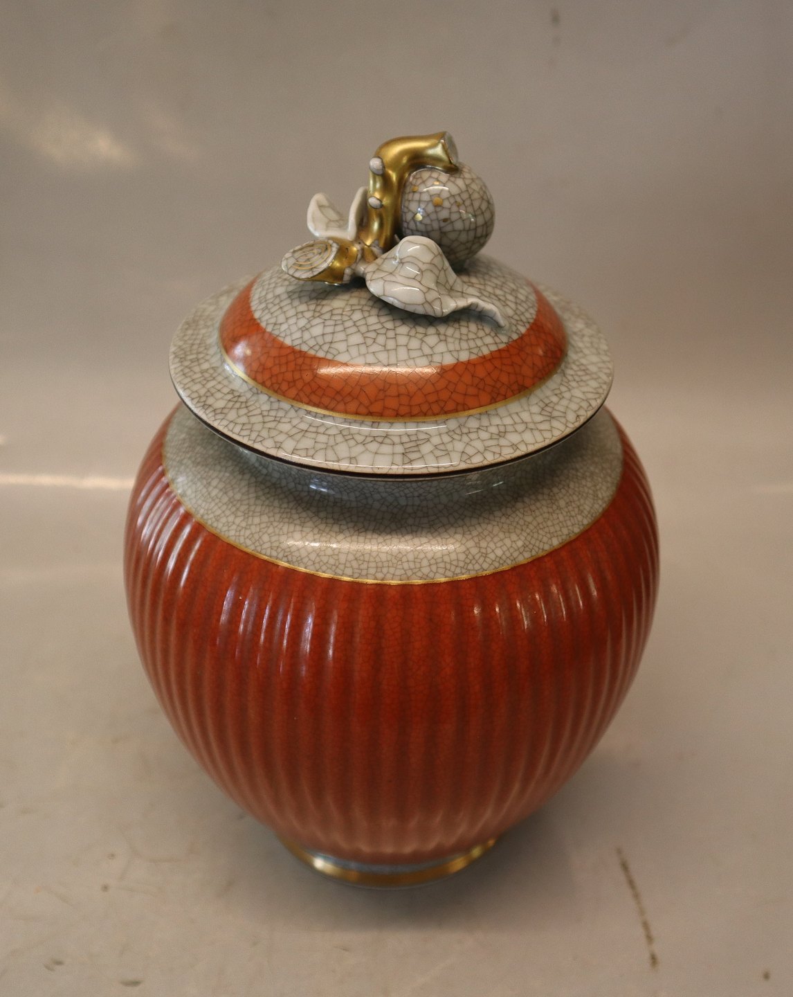 212-2781 Kgl. Lågkrukke med gråt, orange og guld 25 cm Lågvase Craquelé fra Royal Copenhagen I hel og fin stand Urne