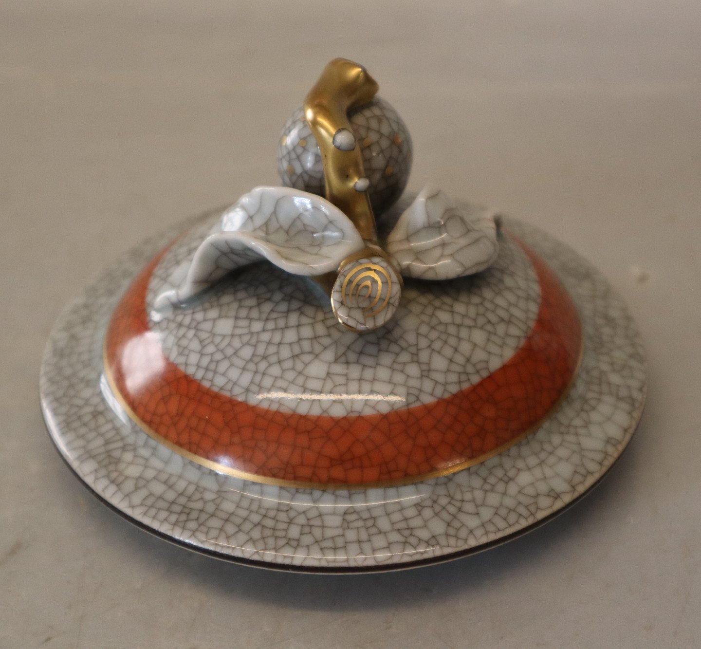 212-2781 Kgl. Lågkrukke med gråt, orange og guld 25 cm Kongelig Dansk Craquelé, Craquele