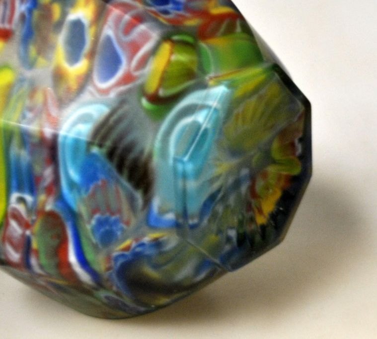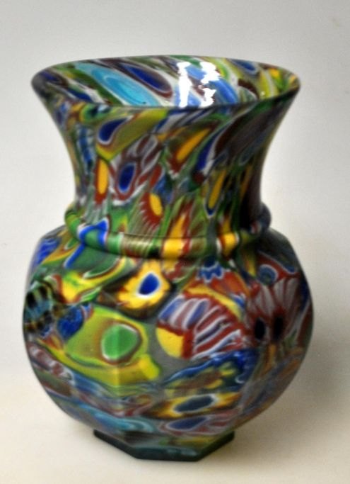 Millefiori vase Johansfors glasbruk, Sverige. Indvendig multifarvet glas; udvendig matteret glas. ca. 1920. H.: 12,5 cm.