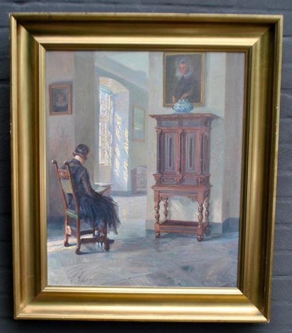 Panitzsch, Robert (1879 - 1949) Denmark: Interior with a woman reading. Oil on canvas. Signed: Pobert Pan. 1932. 62 x 52 cm. Framed: