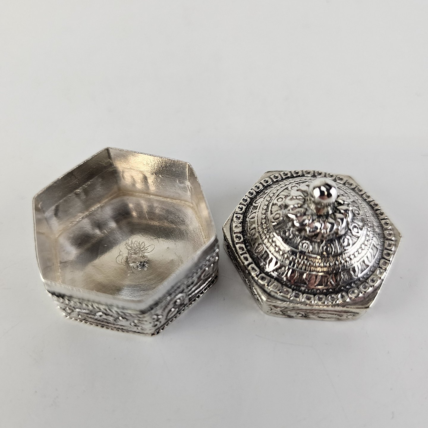 Lille dåse i sølv med koppellåg og dekoreret med blomsterranker