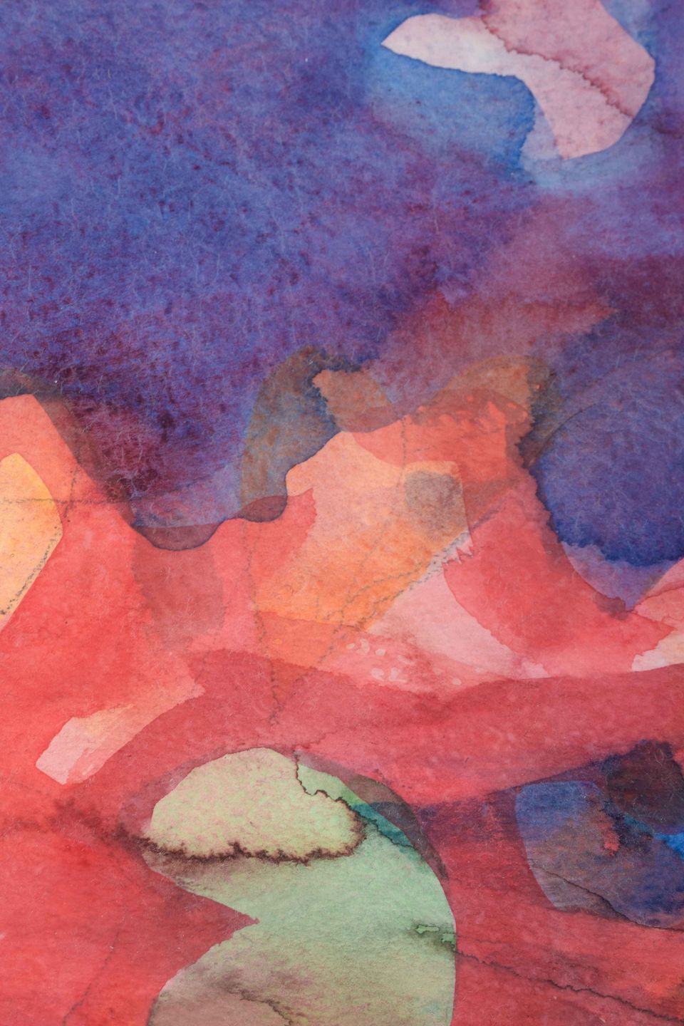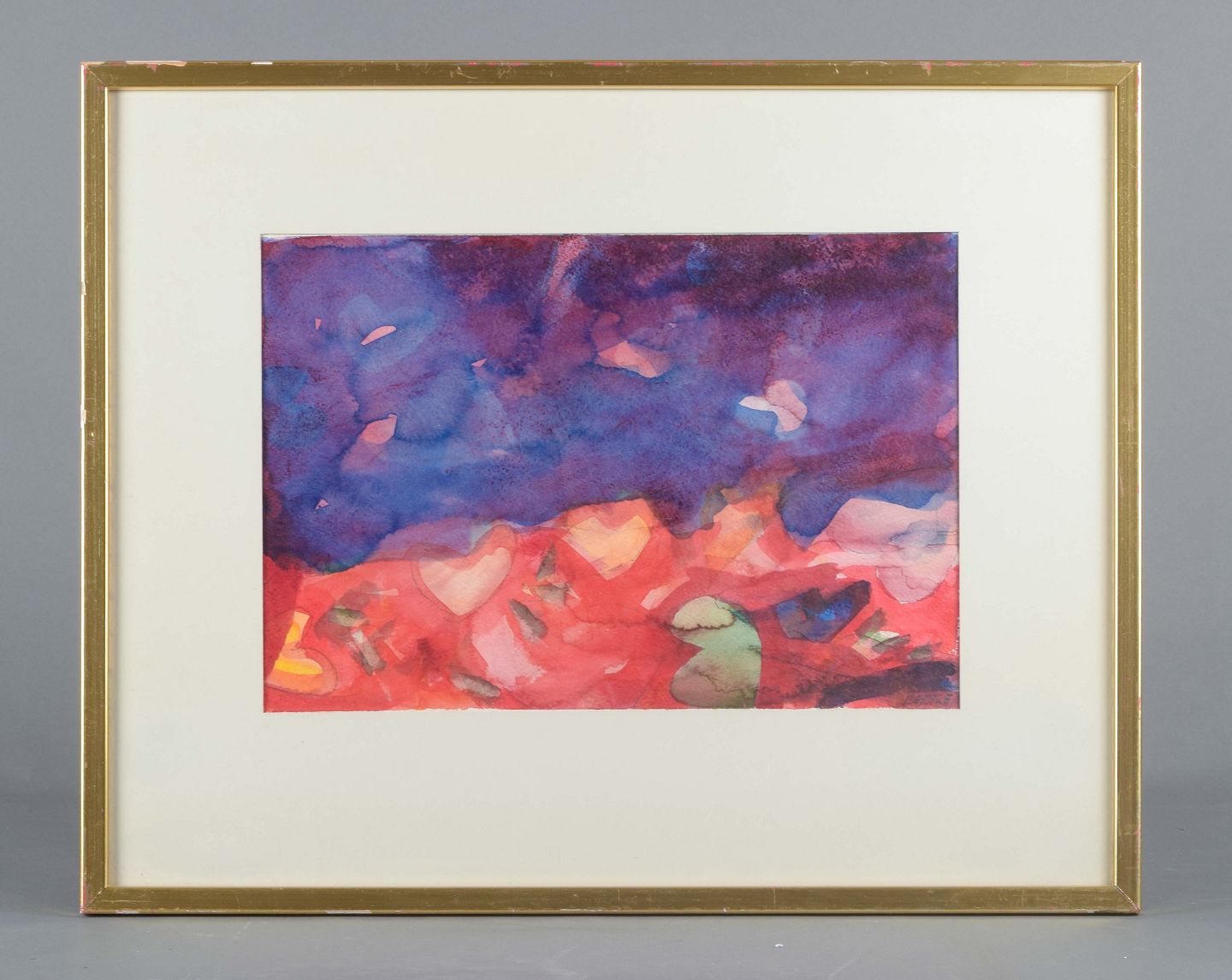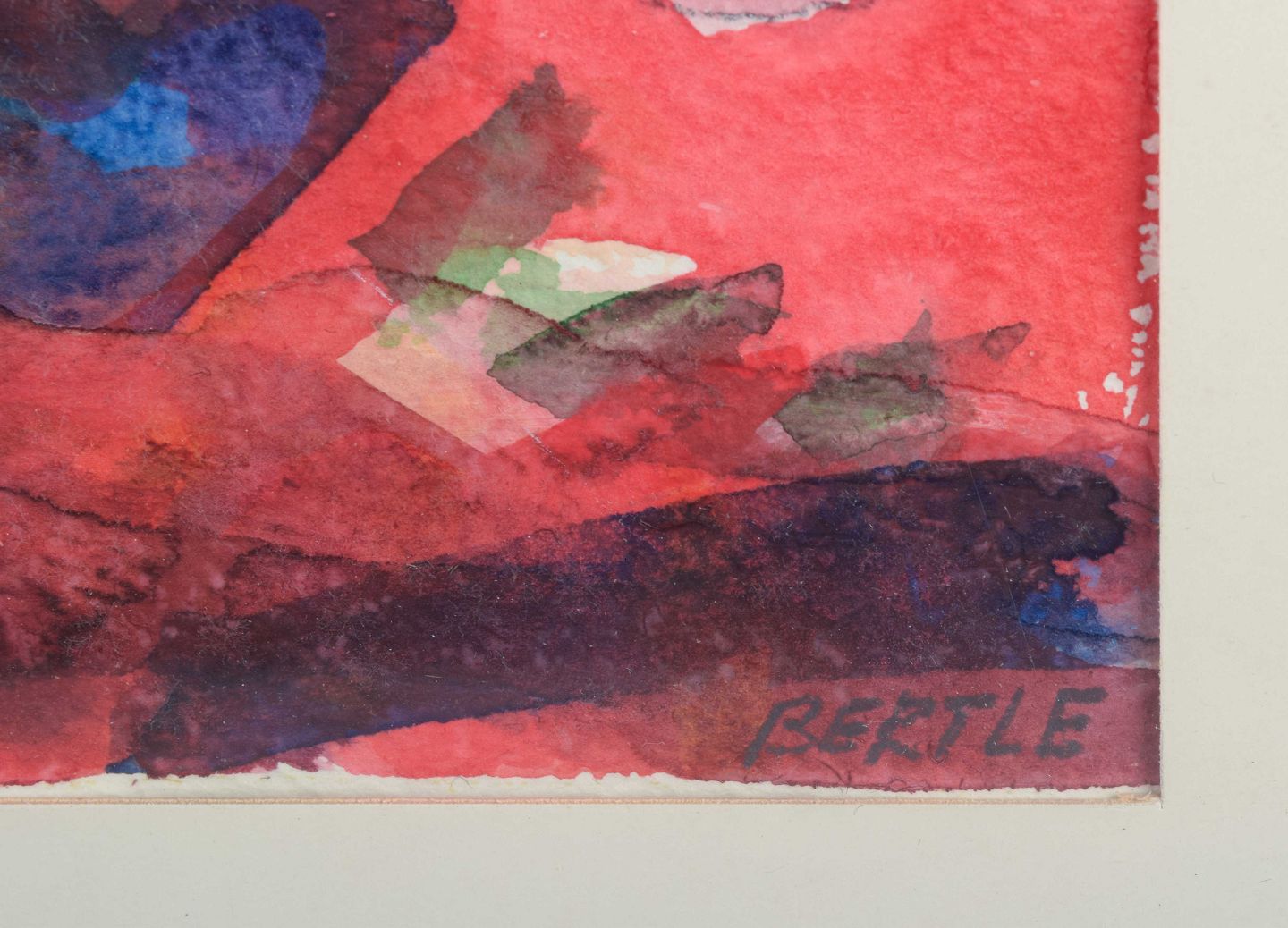 En ekspressiv akvarel af Lars Bertle, hvor intense røde og dybe violette toner danner en følelsesladet abstraktion. Titlen Brustna relationer understøtter værkets dramatiske og poetiske udtryk.