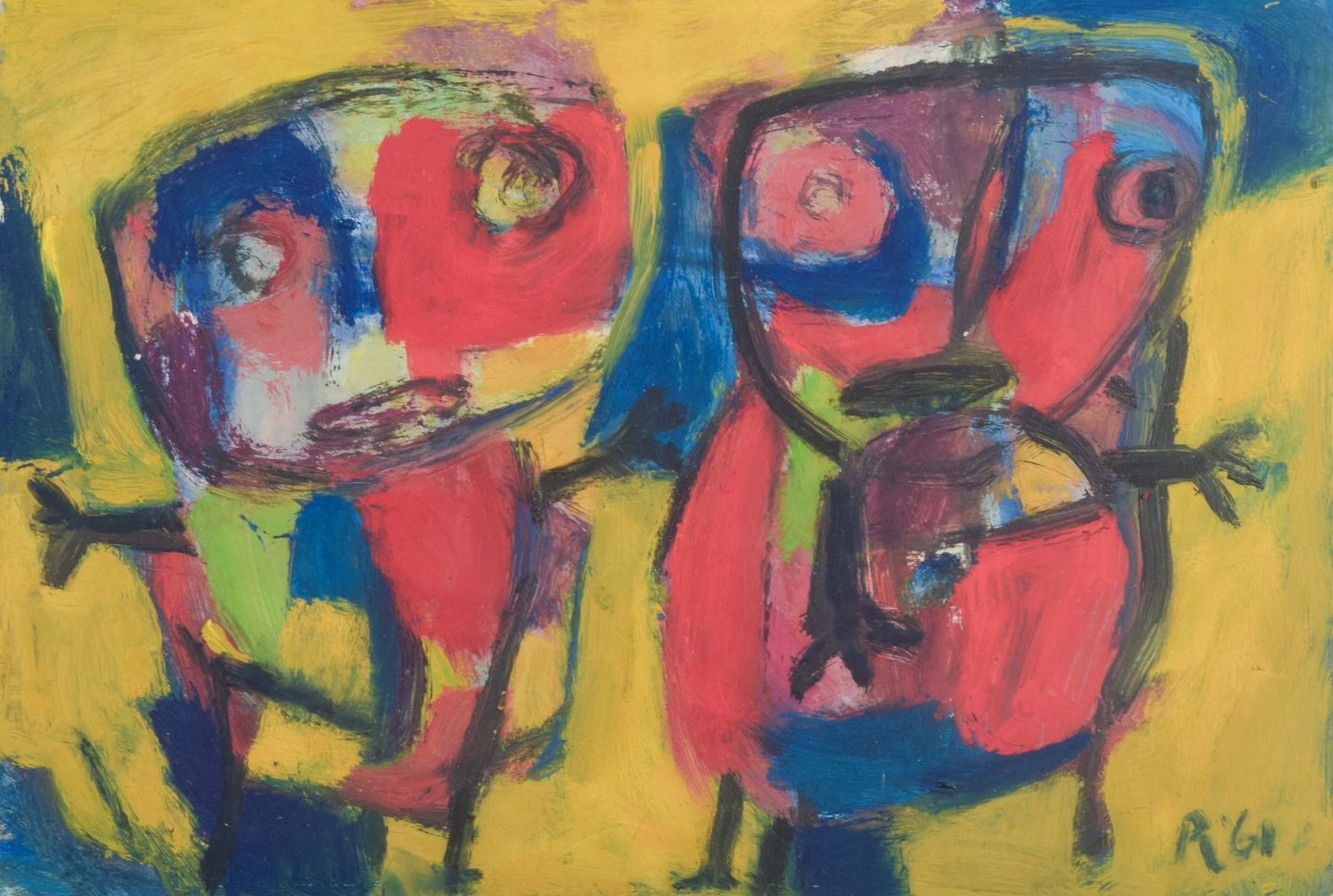 Et kraftfuldt og farvestærkt værk udført i Cobra-traditionen. Maleriet viser to figurative skikkelser, reduceret til primitive og næsten barnlige former, udført i ekspressive penselstrøg med intense farvekontraster i rød, blå, grøn og gul. De spiralformede øjne og de markante konturer understreger det spontane og umiddelbare udtryk, som kendetegner Cobra-kunstnernes oprør mod den etablerede modernisme i efterkrigstiden.