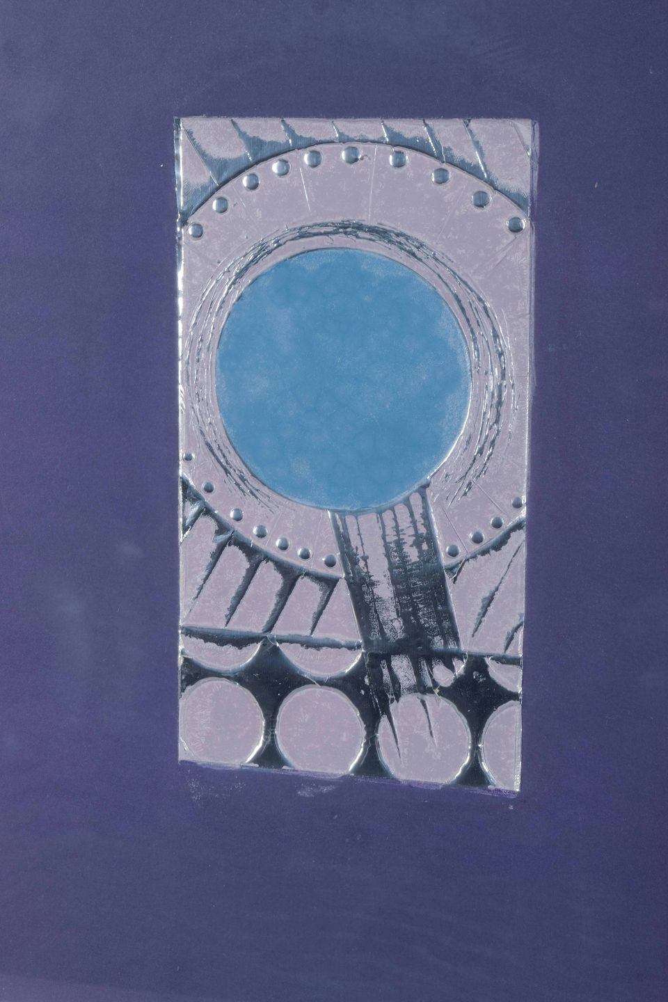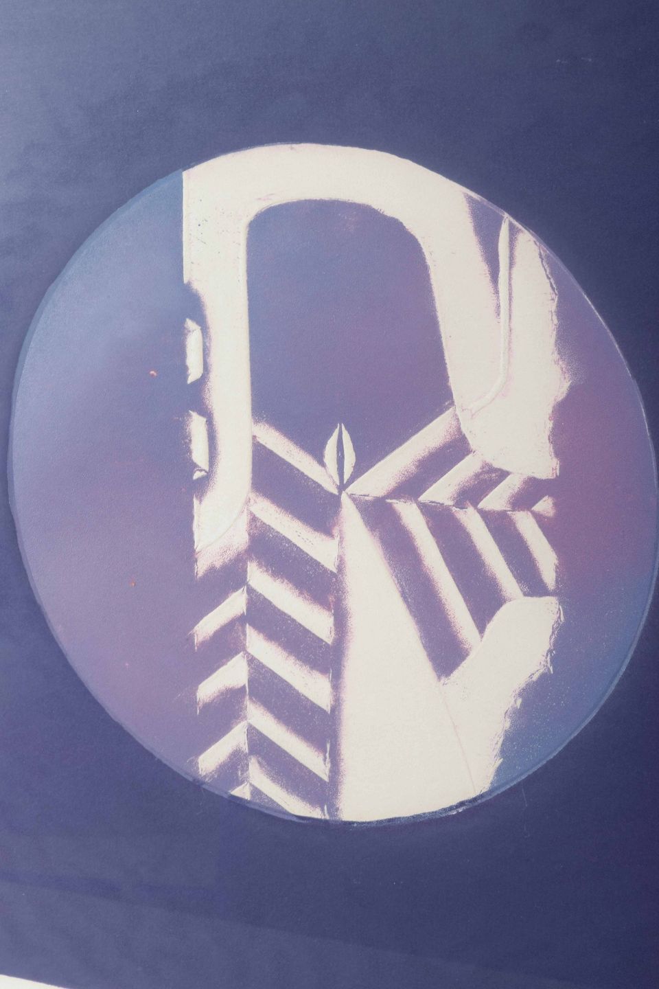 A characteristic graphic work by Gino Scarpa, in which geometric forms and contrasting colors are combined with silver leaf, creating a poetic balance between abstraction and symbolism