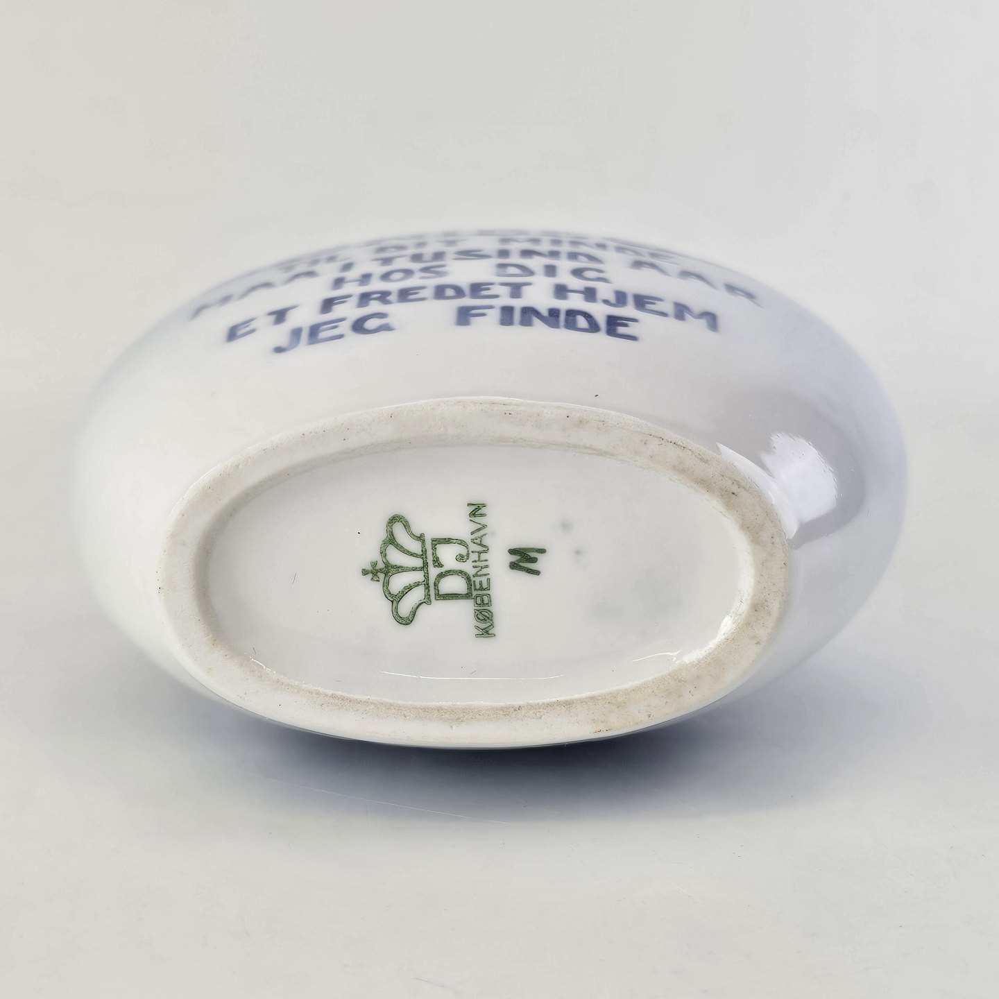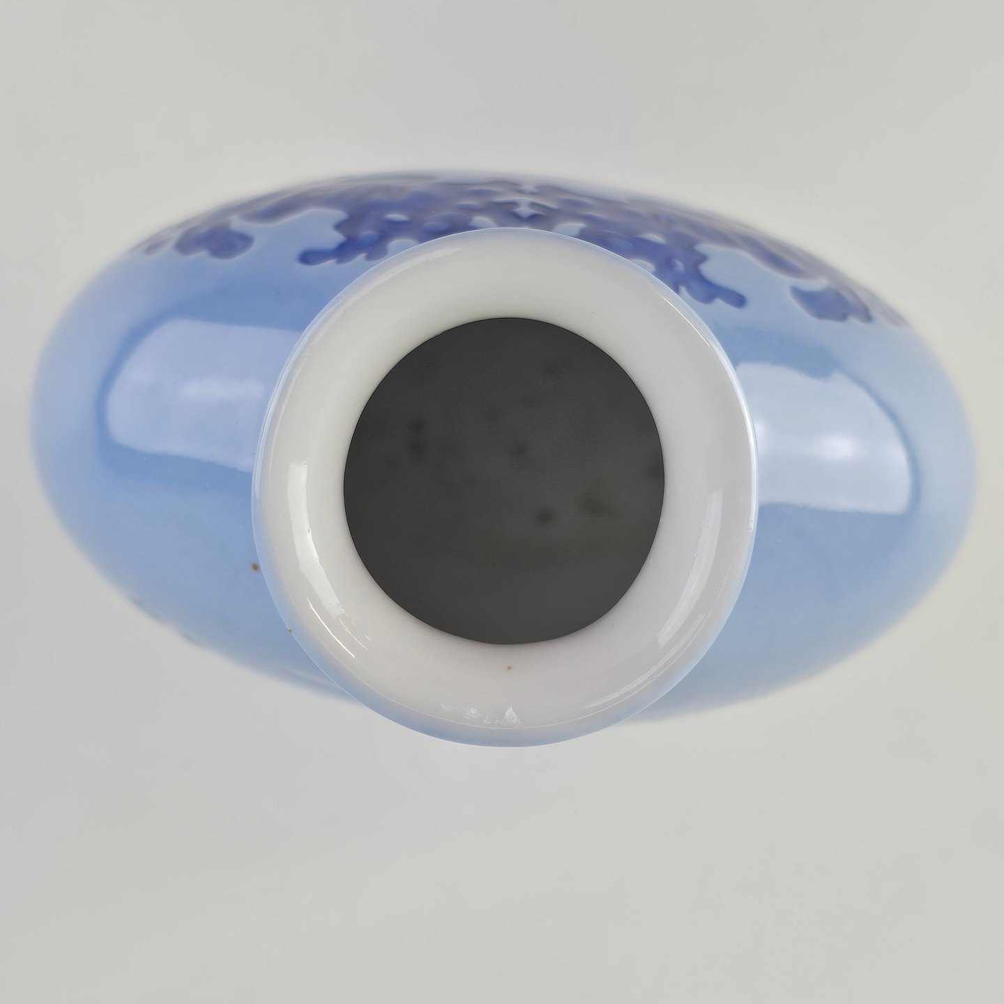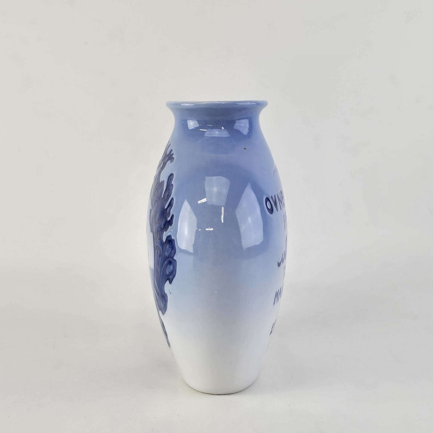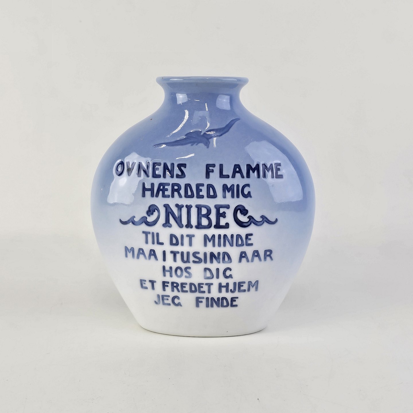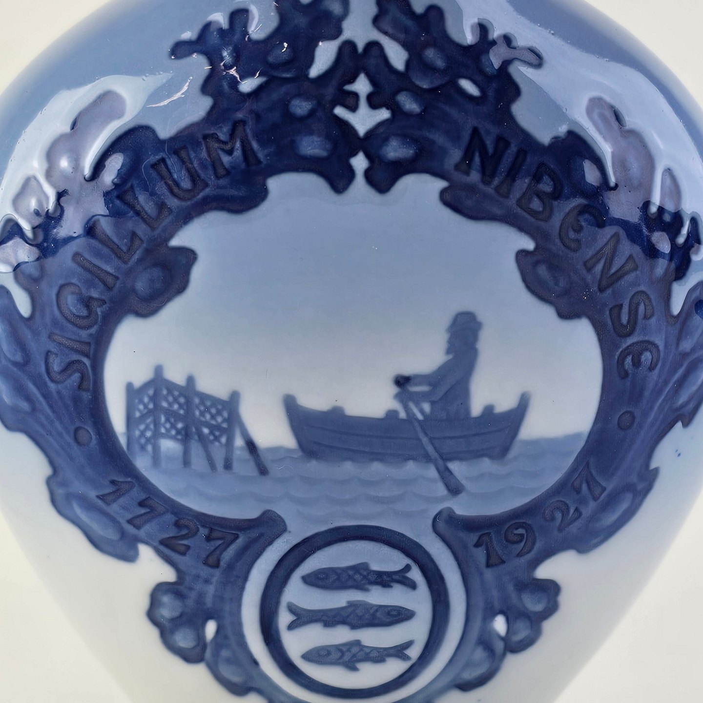 Text available in Danish: Vase i hvidt porcelæn med motiv i blå nuancer, produceret i anledning af Nibes 200 års jubilæum som købstad