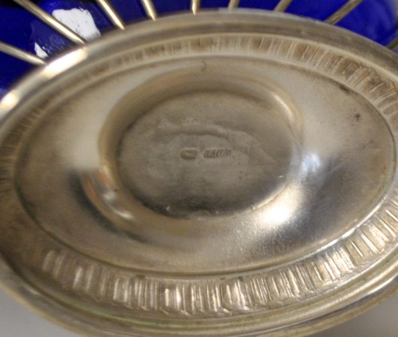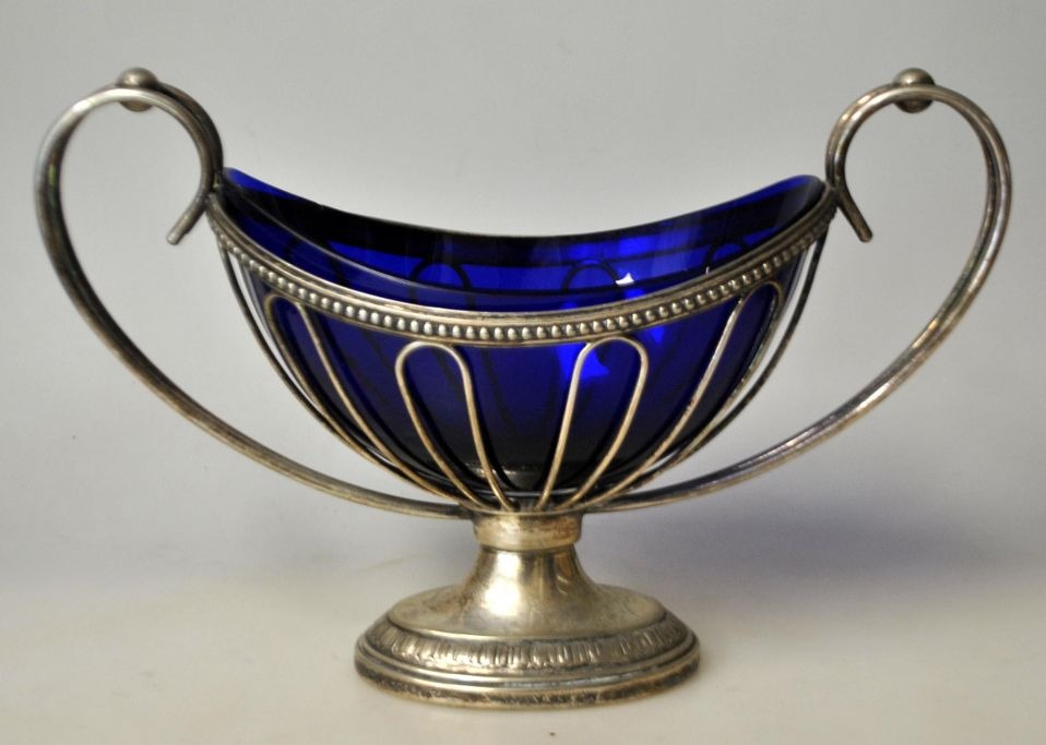 WMF Zucker Schale, ca. 1900. Deutschland. Versilbertes Silber mit kobaltblauem Glaseinsatz. Empire-Stil. H.: 15 cm. L.: 23 cm. Gestempelt.