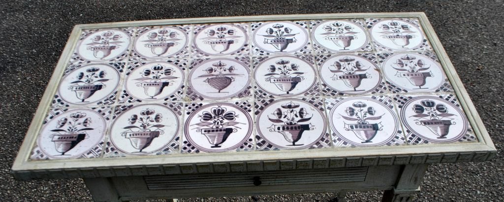 Louis XVI hvidmalet flisebord, 20. årh. Med tilspidsede ben med kannelleringer. Kant med tandsnit. Skuffe, der kan åbnes til begge sider. Med 18 antikke manganfarvede fliser med "blumen pot" motiv. L.: 83 cm. B.: 43,5 cm. H.: 73 cm.