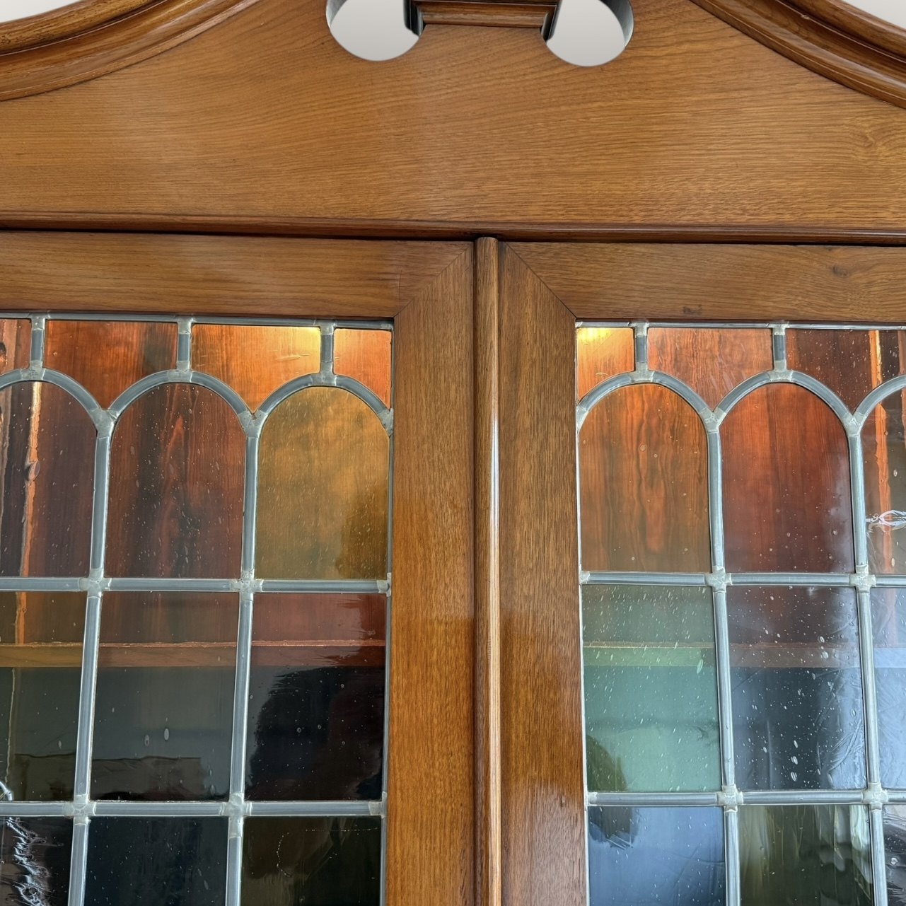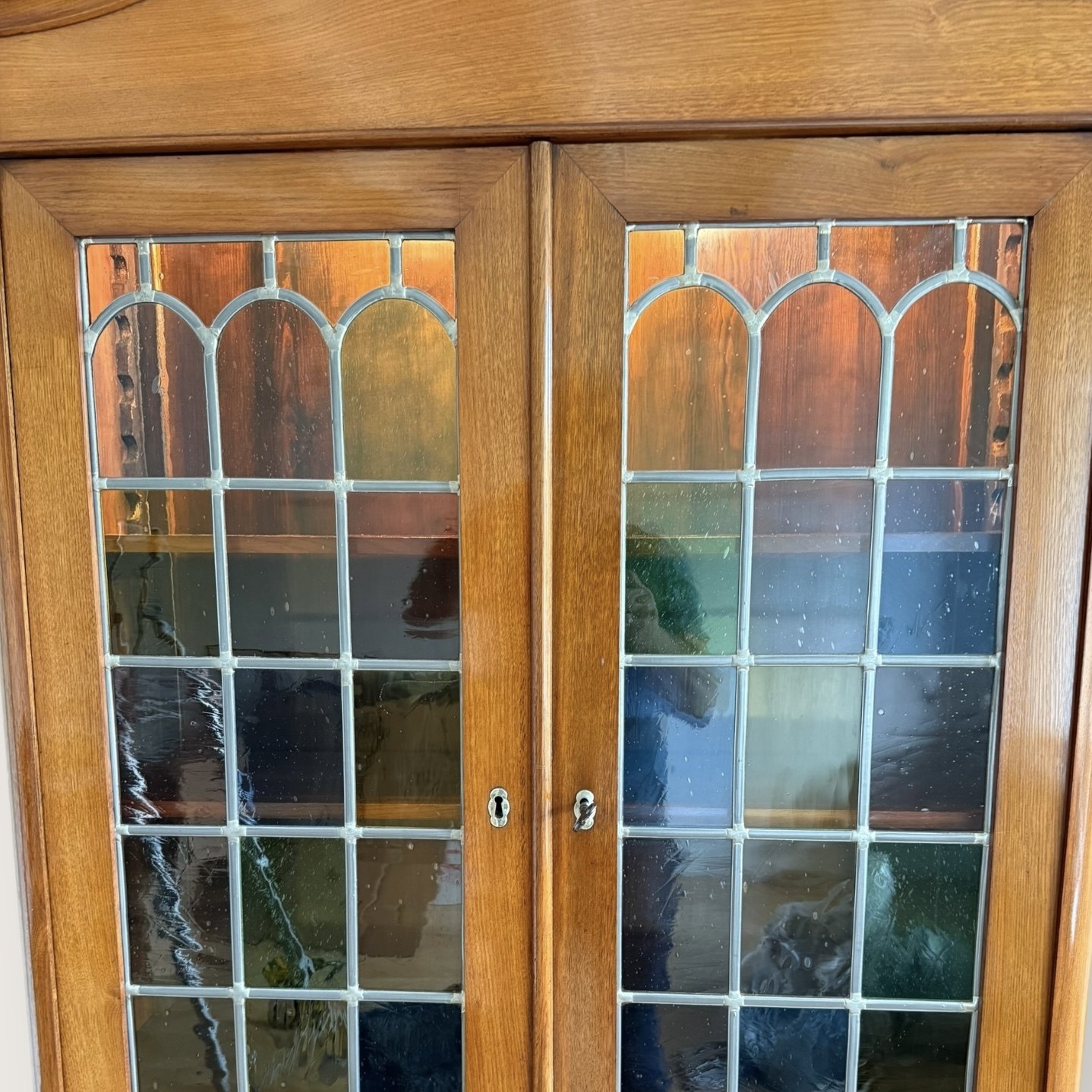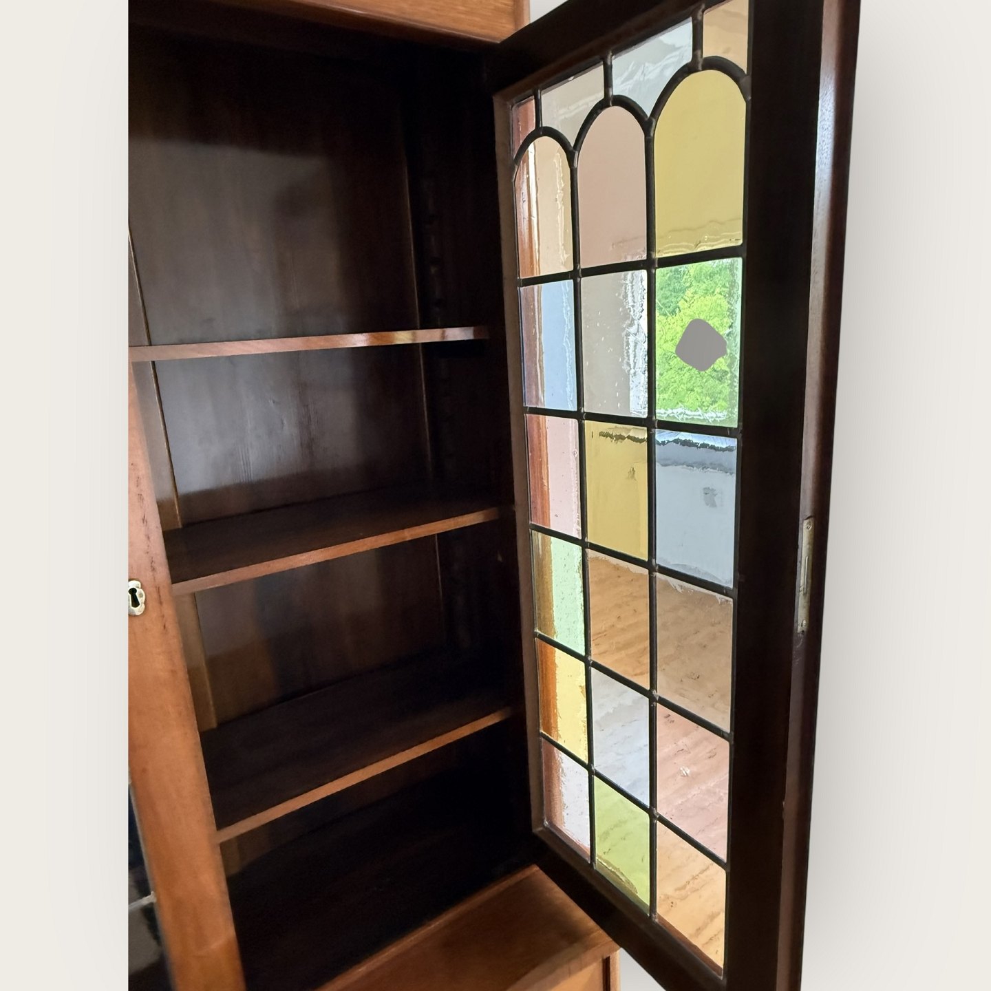 Dækketøjs skab i mahognifiner, overdel med farvede blyindfattede glas samt lys, Fremstår i fin brugt stand, Mål: HxBxD 198x90x39cm