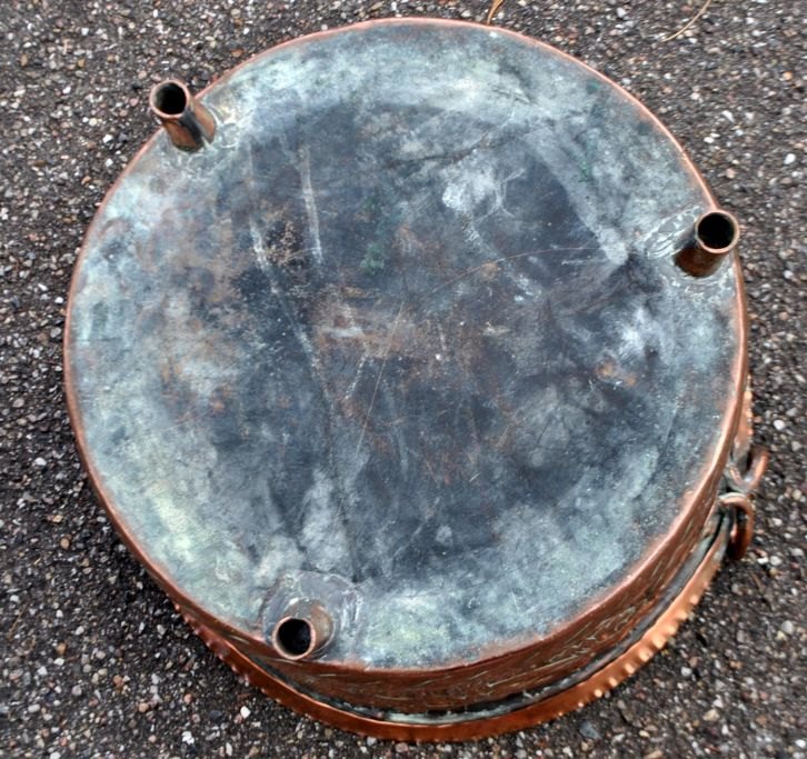 Firewood bucket, Haraldskjær Copper Factory, Vejle, 19th century. Denmark. With three legs and two handles. With intricately beaten decorations on the side. H.: 29 cm. Dia.: 40 cm. Perfect condition!