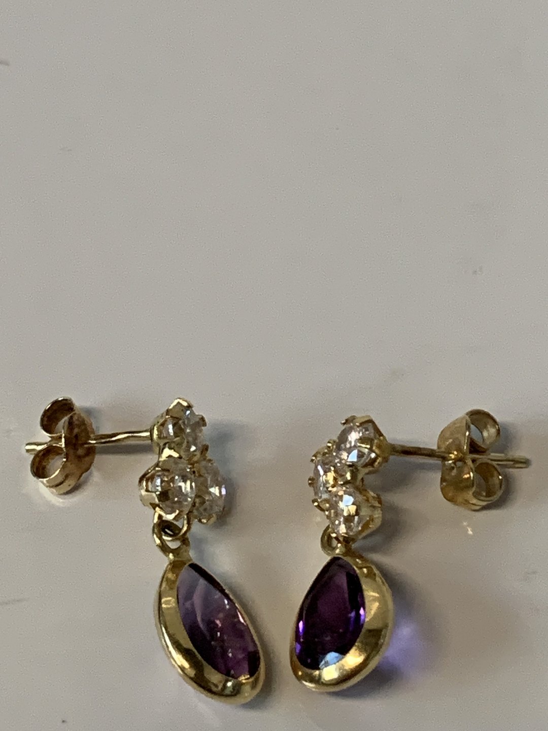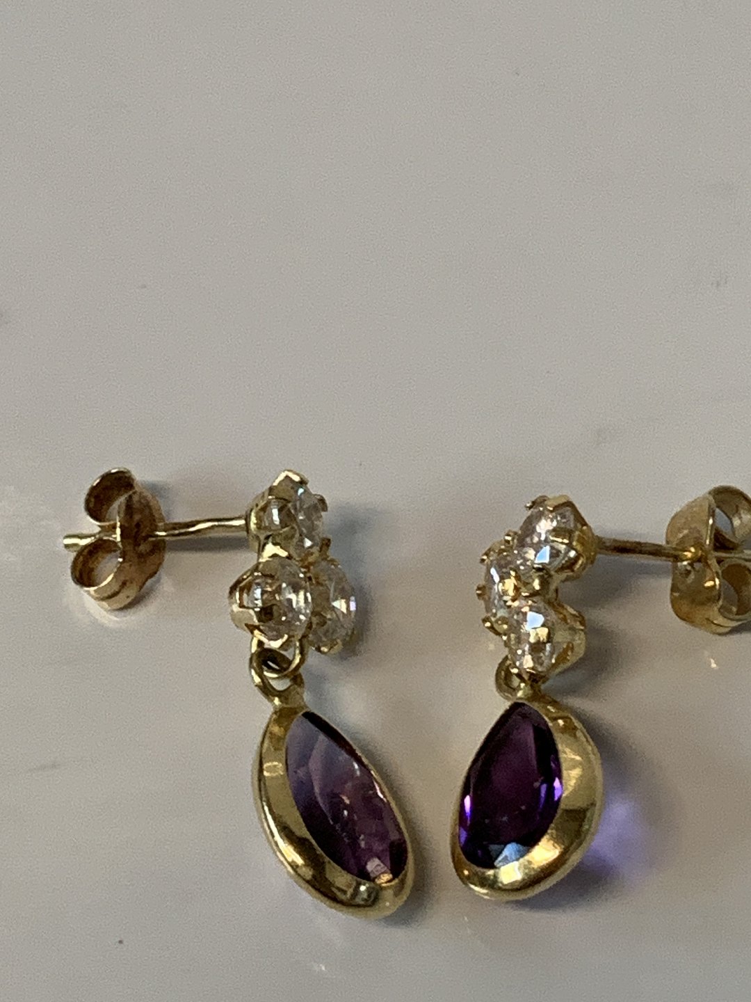 Gold earrings in 14 carat gold, inlaid amethyst and clear stones.